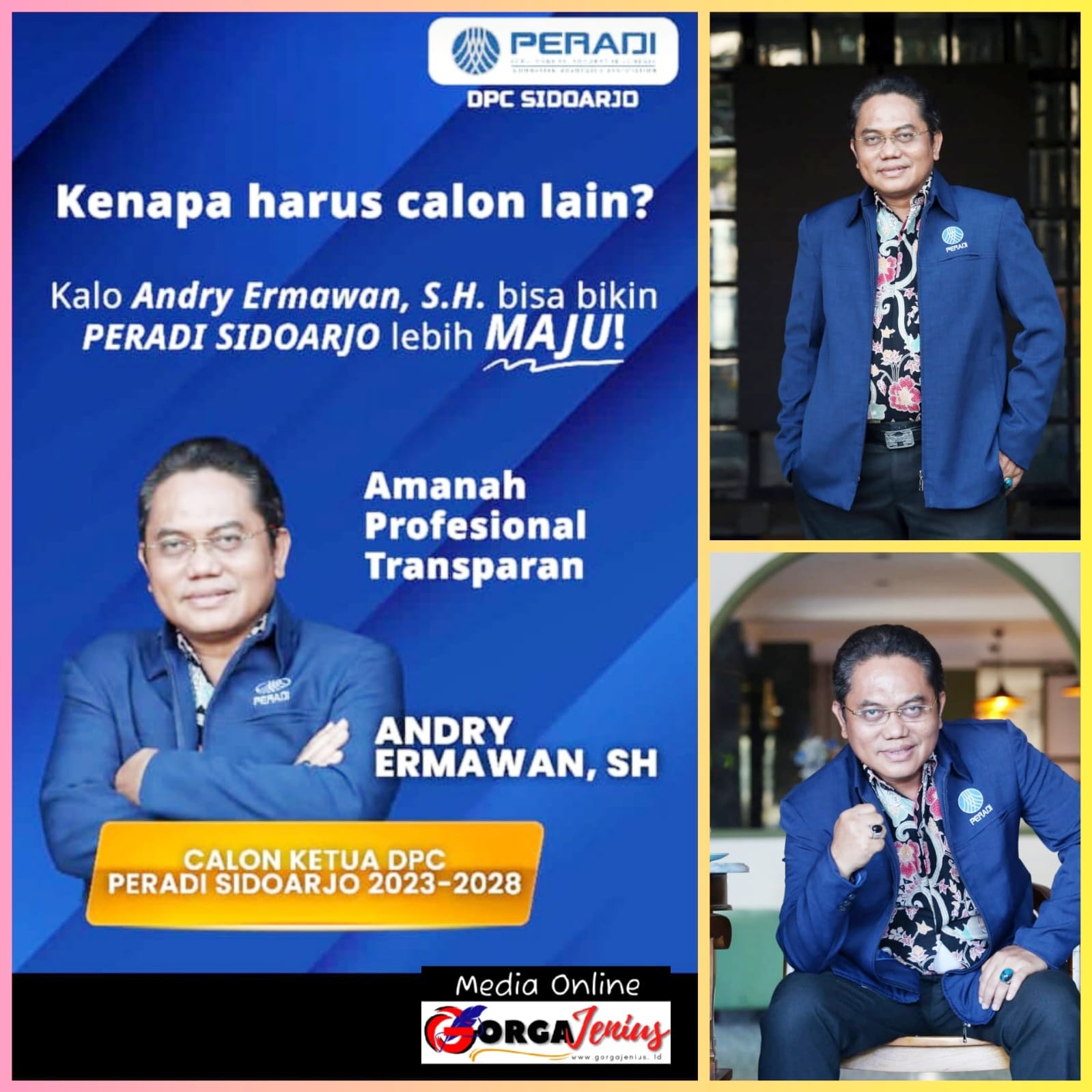 Begitu deras dukungan dari advokat advokat muda untuk mendorong Andry Ermawan SH maju sebagai Calon ketua DPC Peradi Sidoarjo untuk segera memberikan Arus Perubahan dan nuansa yang baru untuk menjadi yang lebih baik, transparan, solid dan bisa merangkul semua kalangan.