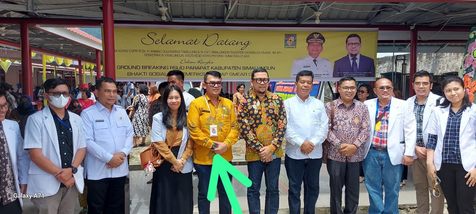Direktur RSUD Parapat Dokter Jimmy (tanda panah) saat diabadikan bersama Bupati Simalungun, para dokter dan ketua komisi II DPR RI, usai Groundbreaking RSUD Parapat di Girsang.
