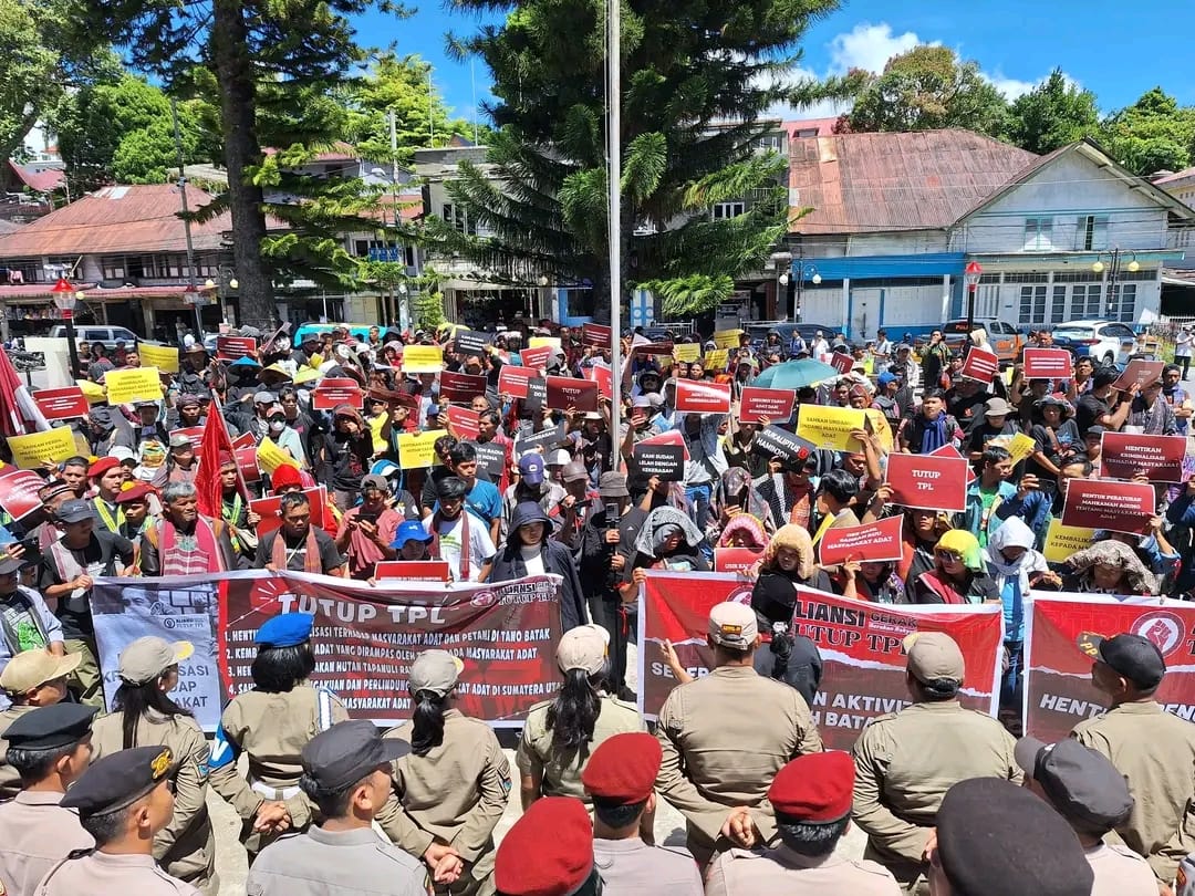Aliansi Masyarakat Tutup PT TPL melakukan demo ke kantor DPRD dan Bupati Tapanuli Utara, Selasa (27 Mei 2025).