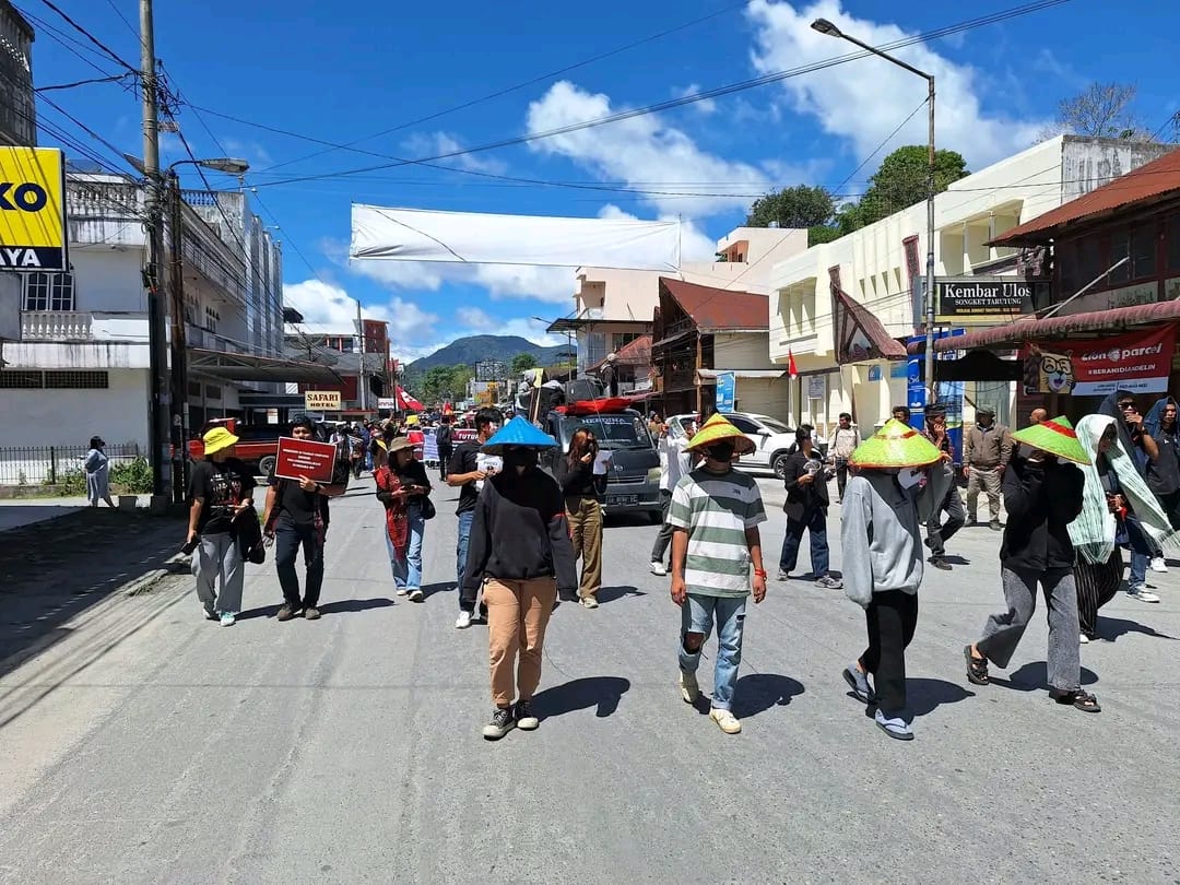 Massa demo berjalan kaki sejauh 2 kilometer dari Terminal Tarutung sambil membawa poster “Tutup PT TPL” dan “Selamatkan Tanah Batak, Selamatkan Tanah Adat”.