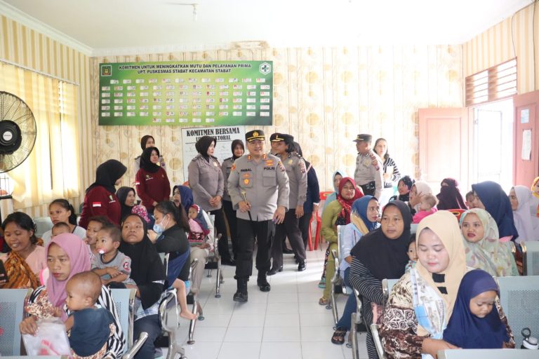 Kapolres Langkat AKBP Faisal Rahmat Husein Simatupang, S.I.K.,S.H.,M.H., meninjau dan memberikan secara langsung pemberian kepada masyarakat berupa paket makanan bergizi dan suplemen kepada anak-anak sebagai antisipasi resiko stunting di Puskesmas Stabat, Kelurahan Stabat Baru, Kecamatan Stabat, Kabupaten Langkat, Jumat (1/9) pagi.