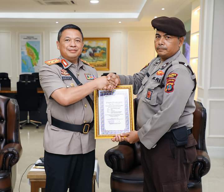 Salah seorang anggota Polres Toba bernama Aiptu Bahagia Perangin-angin mendapatkan penghargaan dari Kapolda Sumut Irjen Pol Agung Setya Imam Effendi di Mapolda Sumut, Rabu (26 Juli 2023).