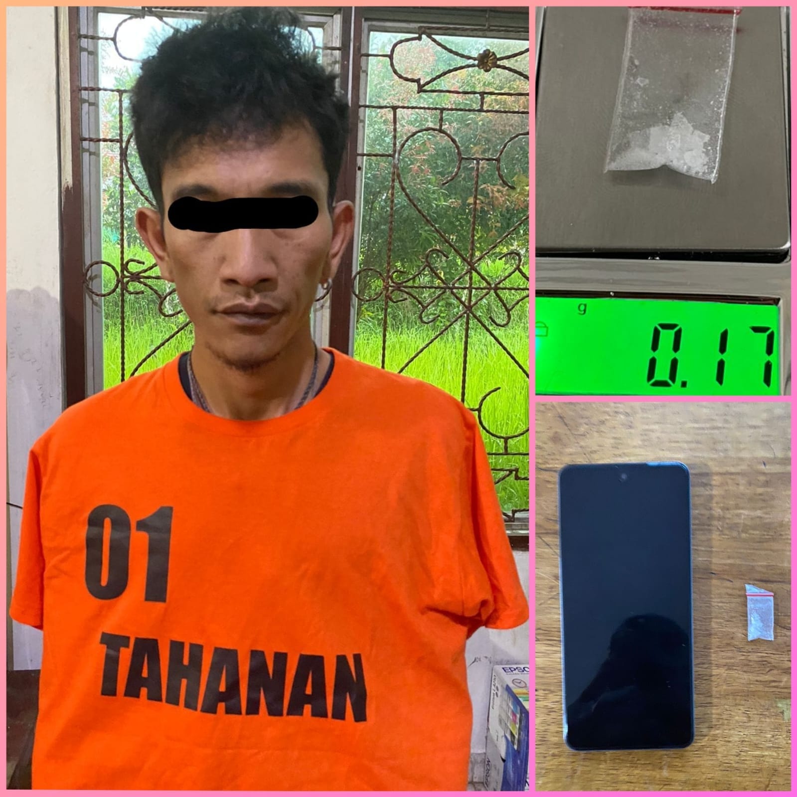 Saat ditangkap, ia kedapatan membawa barang bukti yang mencakup satu klip transparan kecil berisikan sabu dengan berat bruto 0.17 gram, sebuah ponsel merk Oppo, dan sebuah motor Kawasaki Ninja 250 warna putih, “ungkap AKP Irvan.