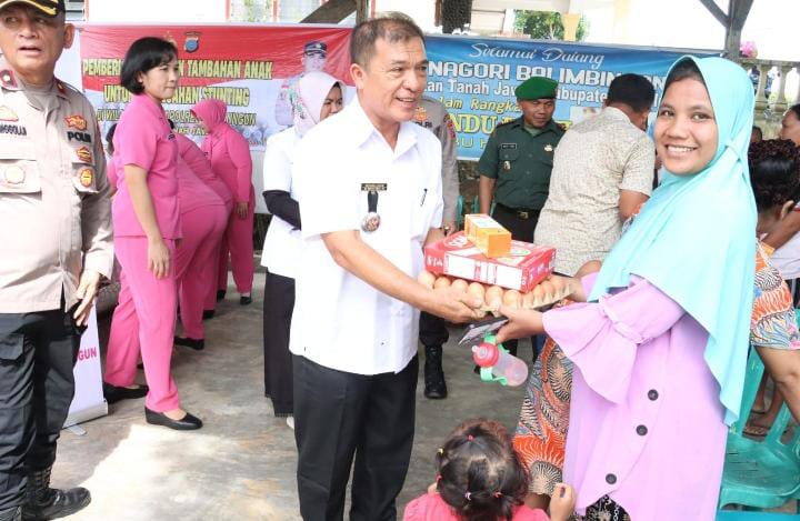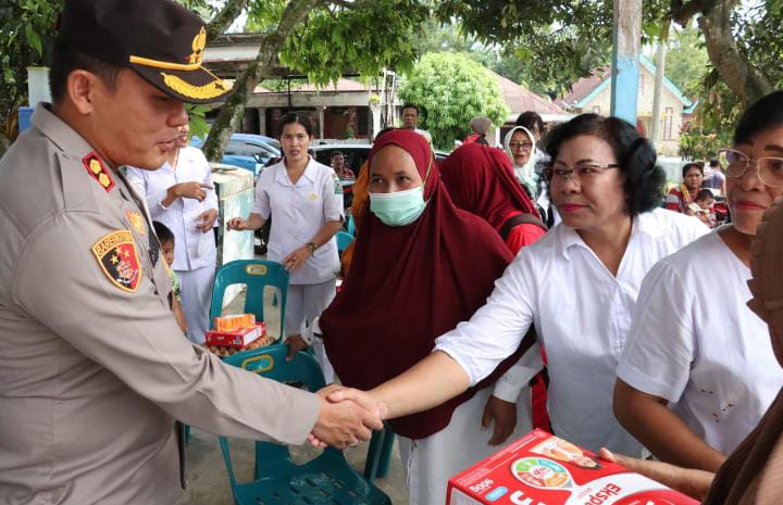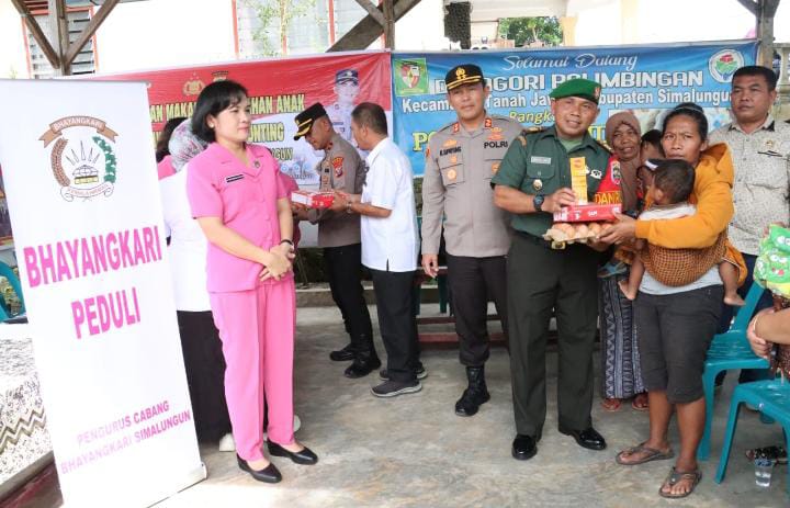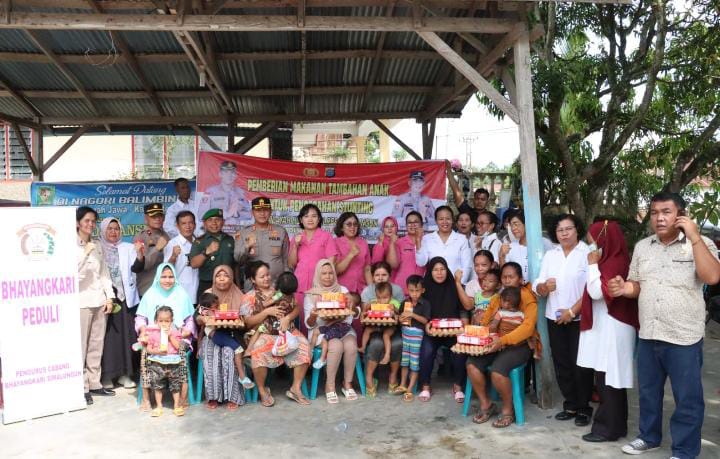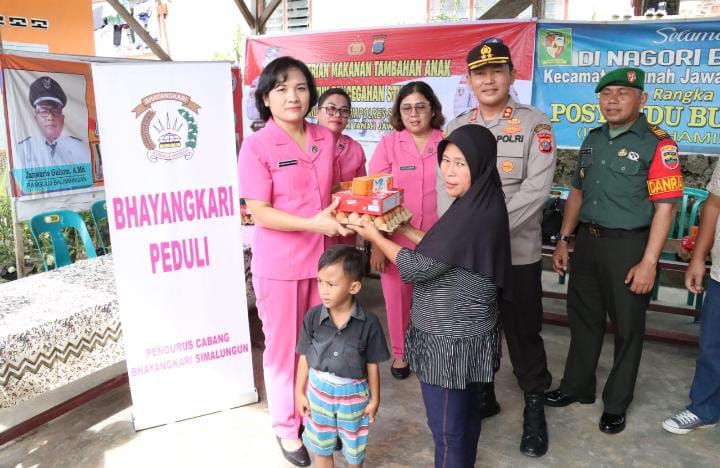 Kapolres Simungun AKBP Ronald F.C Sipayung, S.H., S.I.K., M.H., yang didampingi Ketua Bhayangkari Cabang Simalungun Ny.Erika Ronald Sipayung., melaksanakan kegiatan Pemberian Makanan Anak Untuk Pencegahan Stunting atau PMT(Pemberian Makan Tambahan) Stunting Tahap-III Kepada 110 (Seratus sepuluh) Anak Asuh Polres Simalungun yang berada di 18 (delapan belas) Nagori Se-Kabupaten Simalungun, diberikan secara langsung kepada masyarakat di Posyandu Mawar, Puskesmas Nagori Balimbingan, Kecamatan Tanah Jawa, Kabupaten Simalungun. Rabu (10/5/2023) sekira Pkl.09.00 WIB.