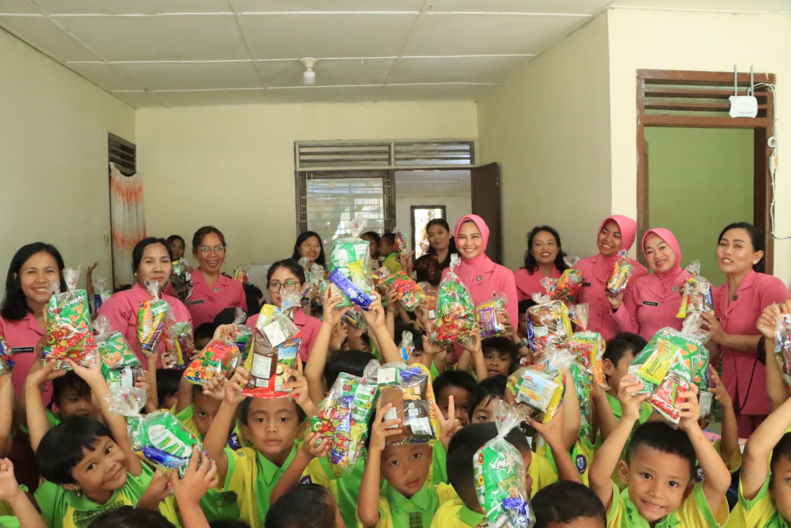 Selanjutnya, Ketua Bhayangkari dan pengurus membagikan snack kepada para anak-anak TK Rajawali, dengan jumlah total 156 bungkus.