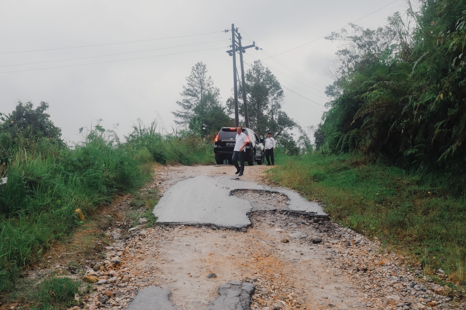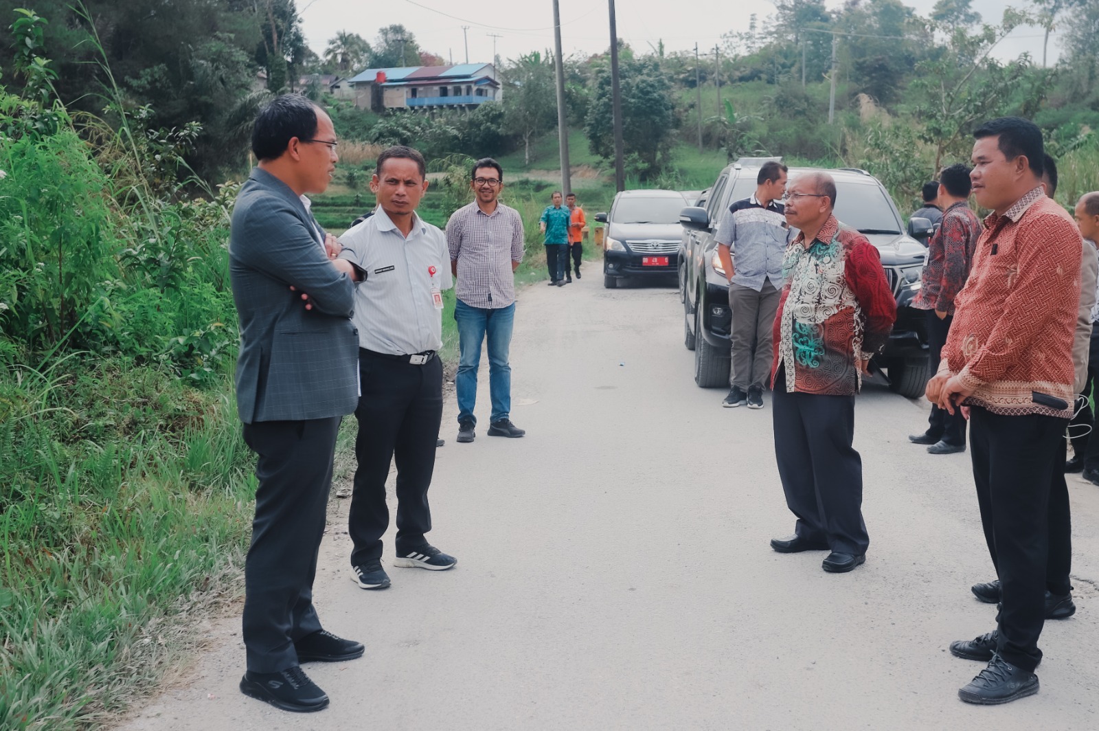 Bupati Humbahas Dosmar Banjarnahor, SE bersama Inspektur Drs BP Siahaan, Kadis Pertanian dan Ketapang Ir Junter Marbun, Kadis Perumahan dan Kawasan Permukiman Anggiat Manullang, Kadis Kominfo Batara Franz Siregar, Sekretaris PUTR Reinward Marpaung dan lainnya meninjau pembangunan jalan di Pangungkitan-Pusuk I Kecamatan Parlilitan, Jumat, 7 Juli 2023.