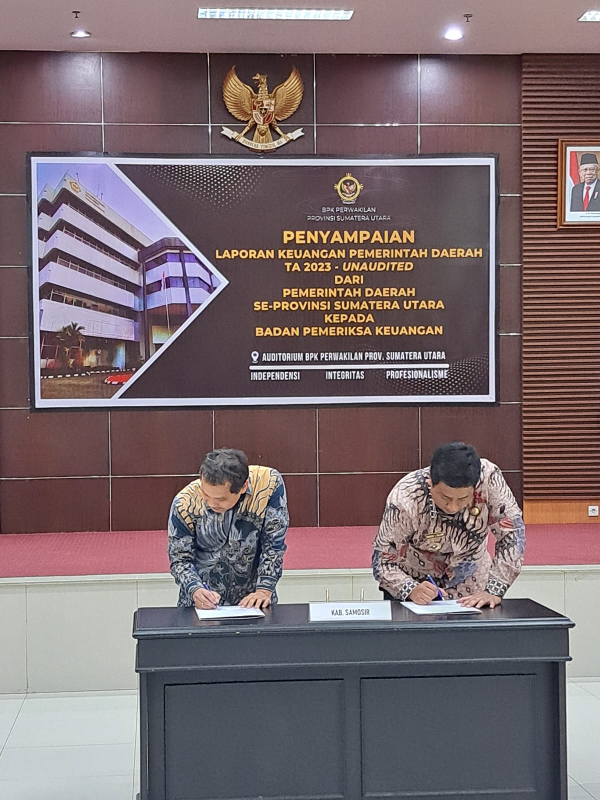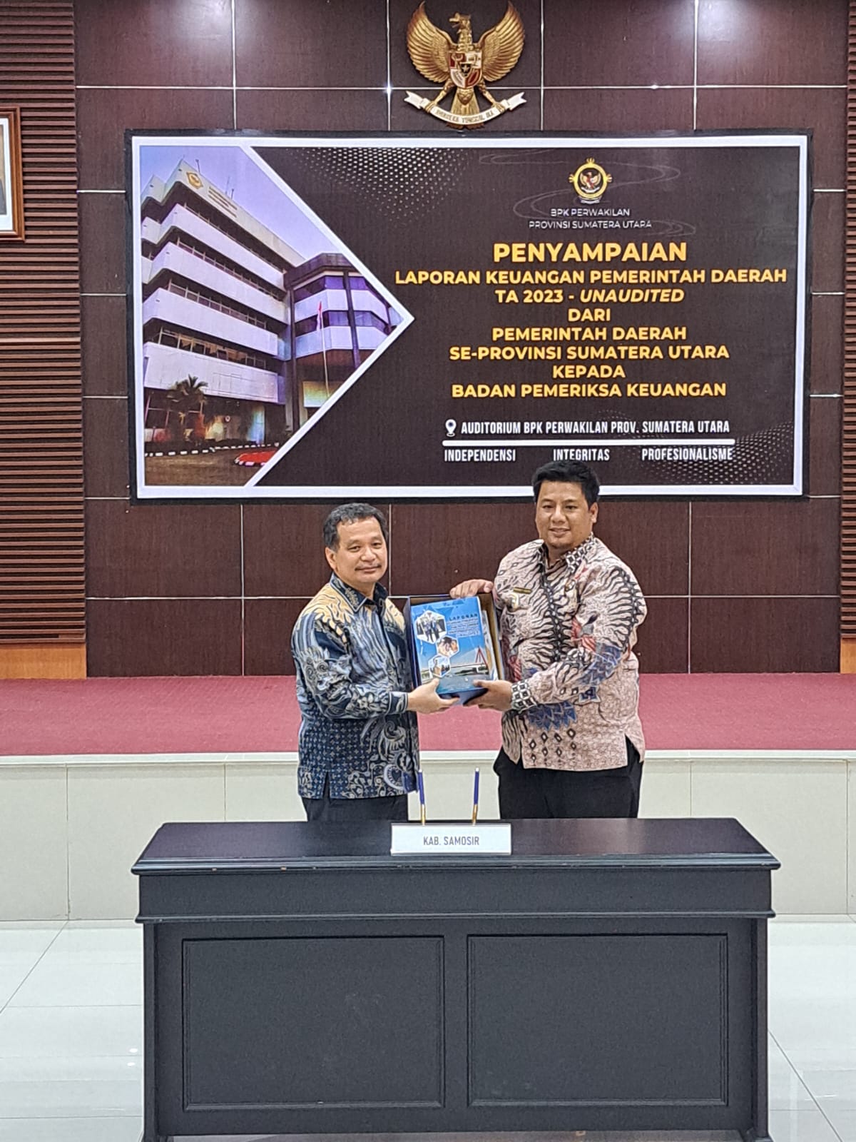 Kepala Badan Pemeriksa Keuangan (BPK) RI Perwakilan Sumut Eydu Oktain Panjaitan SE., MM, Ak, CA, CSFA, menyampaikan apresiasi terhadap kinerja dan laporan keuangan Pemkab Samosir Tahun Anggaran 2023. Laporan Keuangan Pemerintah Daerah (LKPD) dapat disampaikan lebih cepat dari waktu yang telah di tentukan sesuai amanat UU No. 1 Tahun 2004.