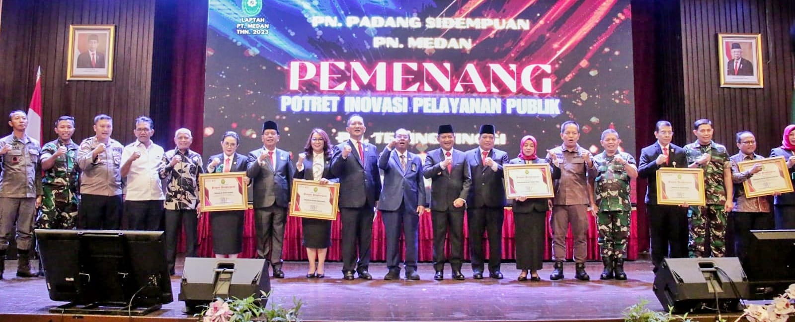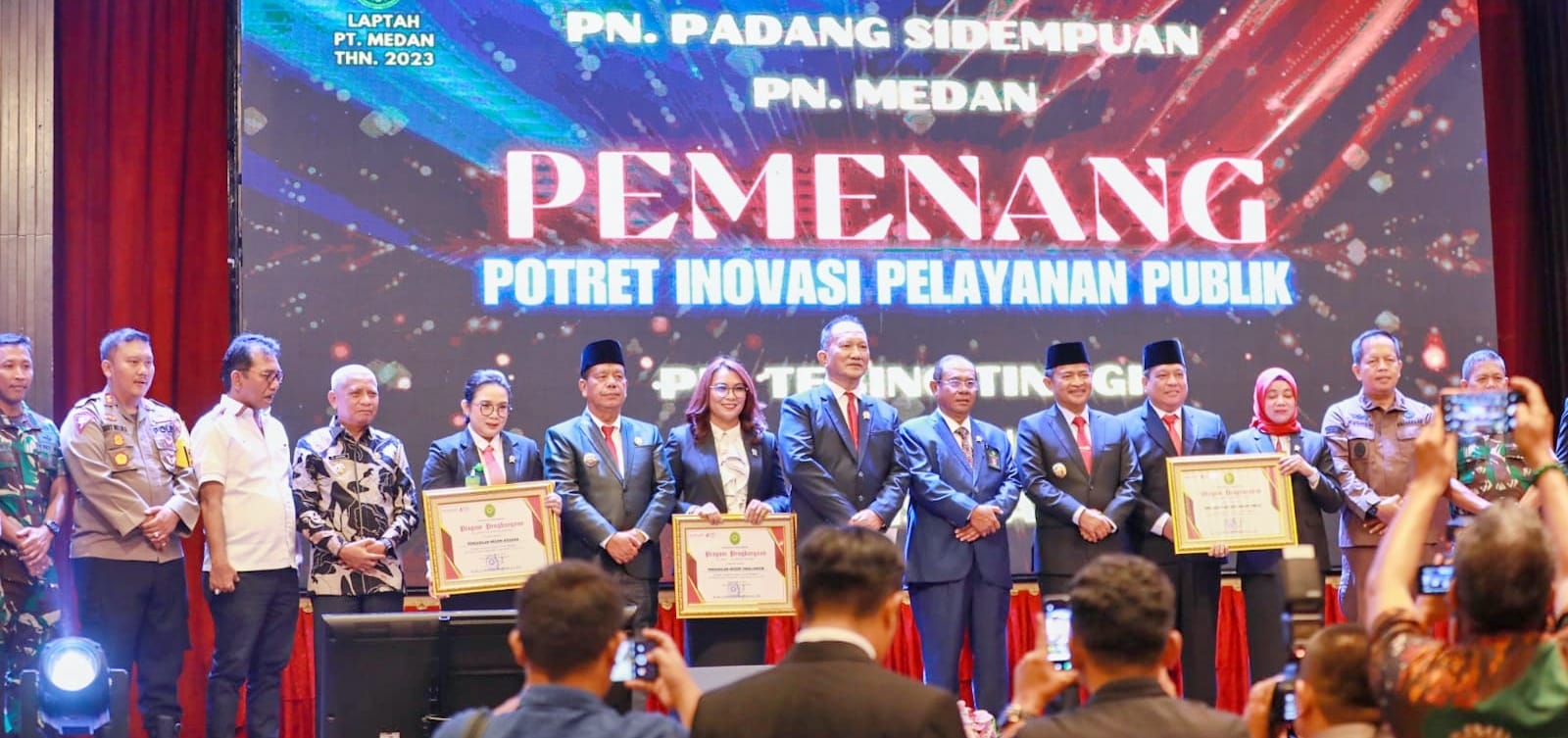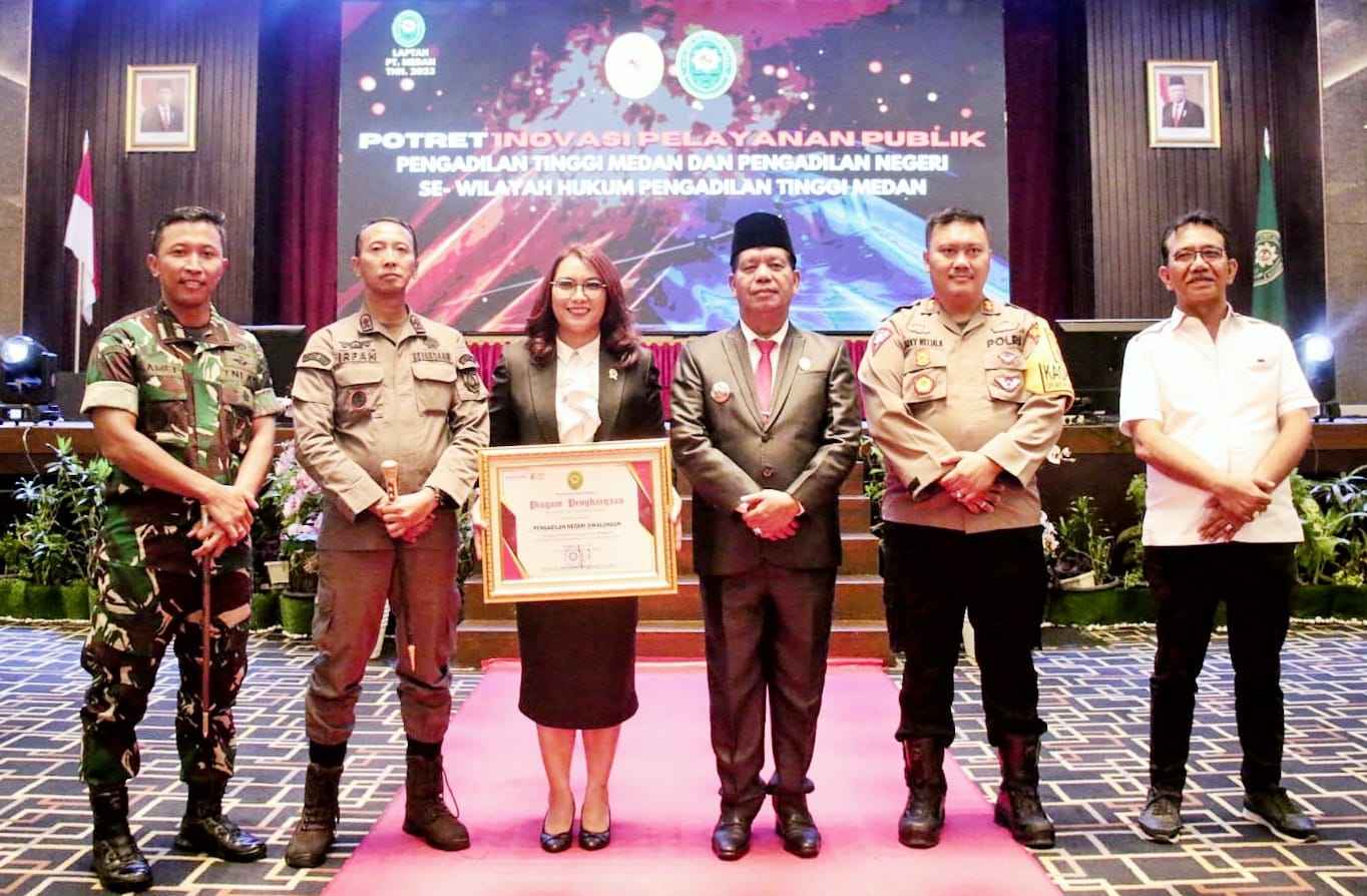 Dalam kesempatan itu, Pj Gubsu dan Ketua Pengadilan Tinggi Medan menyerahkan penghargaan kepada Ketua Pengadilan Negeri Simalungun sebagai juara 4 pemenang Potret Inovasi Pelayanan Publik Tingkat Pengadilan se-Sumatra Utara.