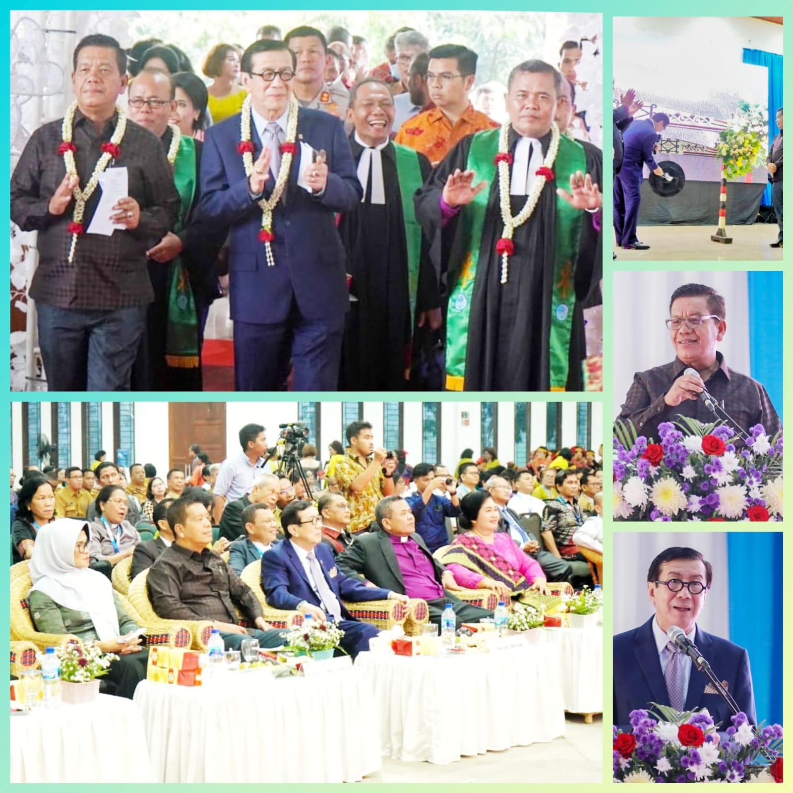 Bupati Simalungun Radiapoh Hasiholan Sinaga bersama Menteri Hukum dan HAM RI Yasonna H Laoly di dampingi Kapolres Simalungun AKBP Ronald FC Sipayung menghadiri acara Sinode Am Kerja (SAK) XXIII GKPI Tahun 2023.