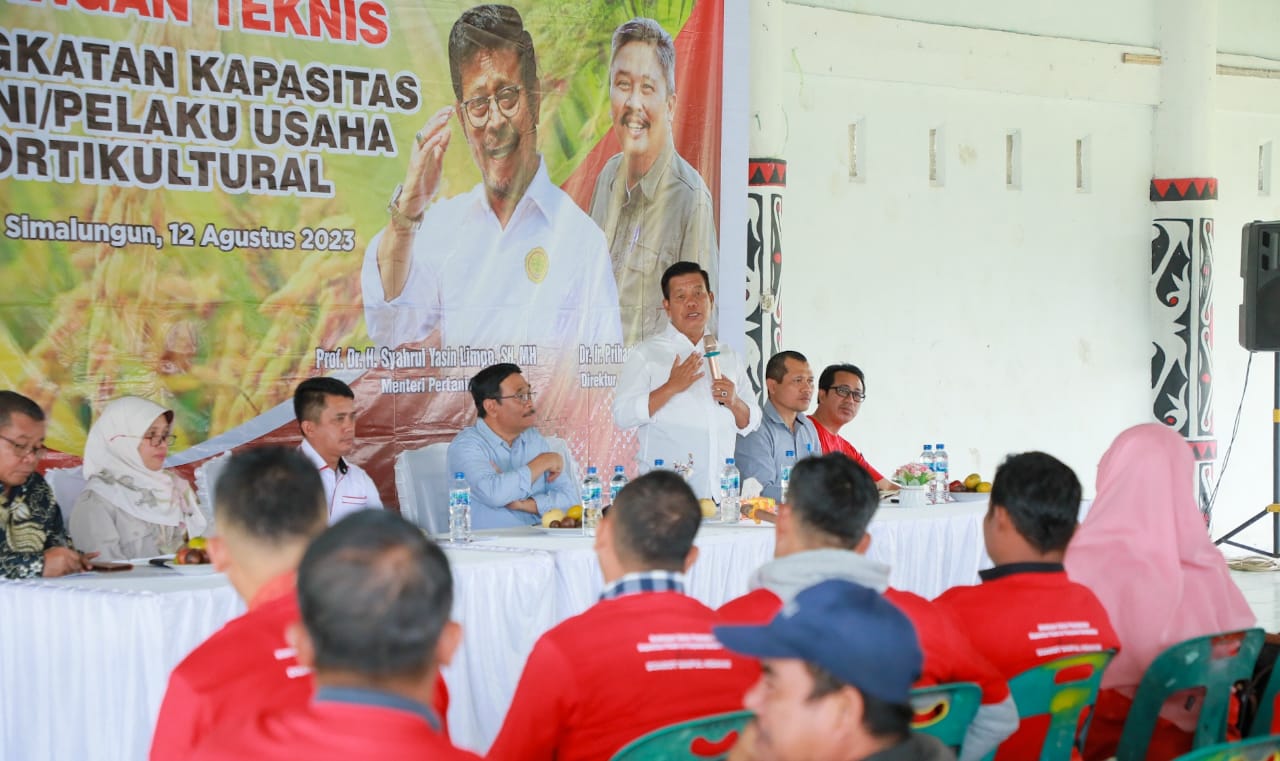 Bupati Simalungun Radiapoh Hasiholan Sinaga menghadiri Bimbingan Teknis (Bimtek) Peningkatan Kapasitas Pertanian/Pelaku Usaha Holtikultural di gedung Serba Guna, Pamatang Raya Kecamatan Raya, Simalungun, Sumut, Sabtu (12/8/2023).