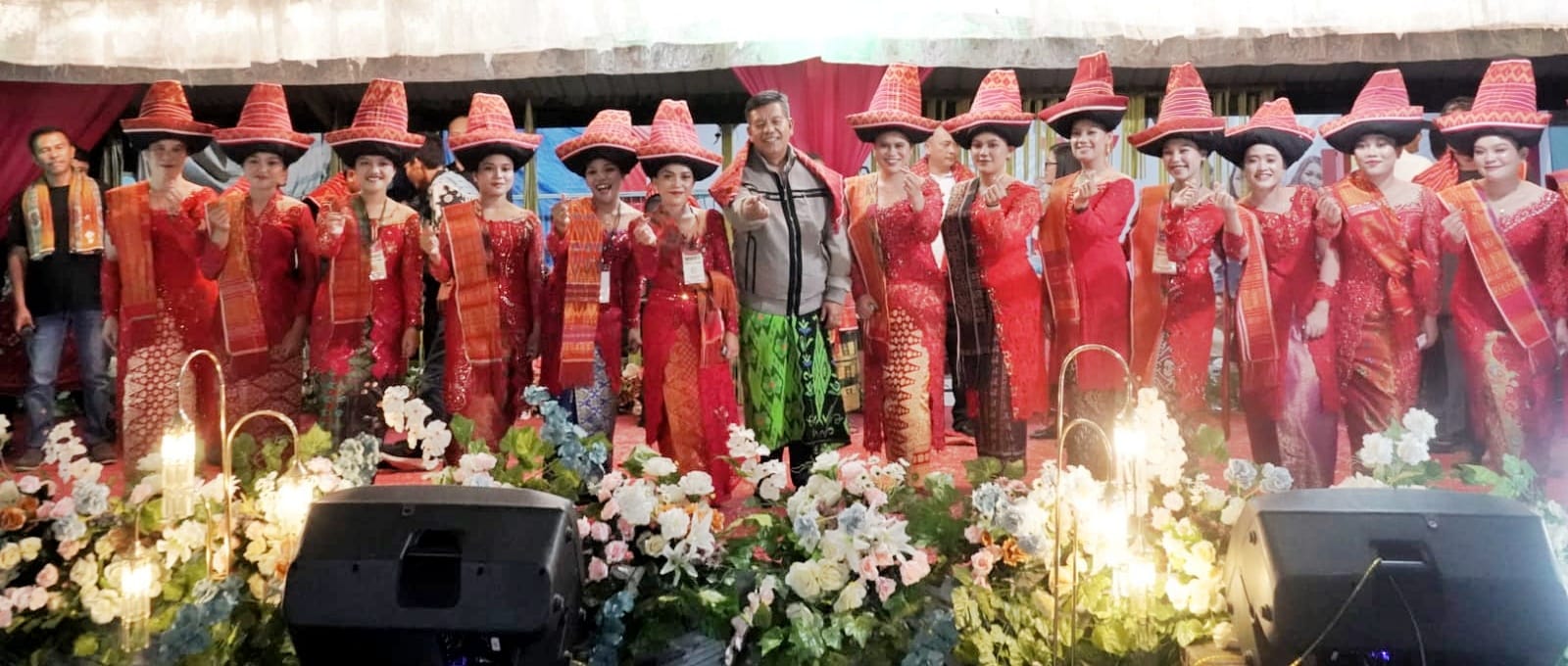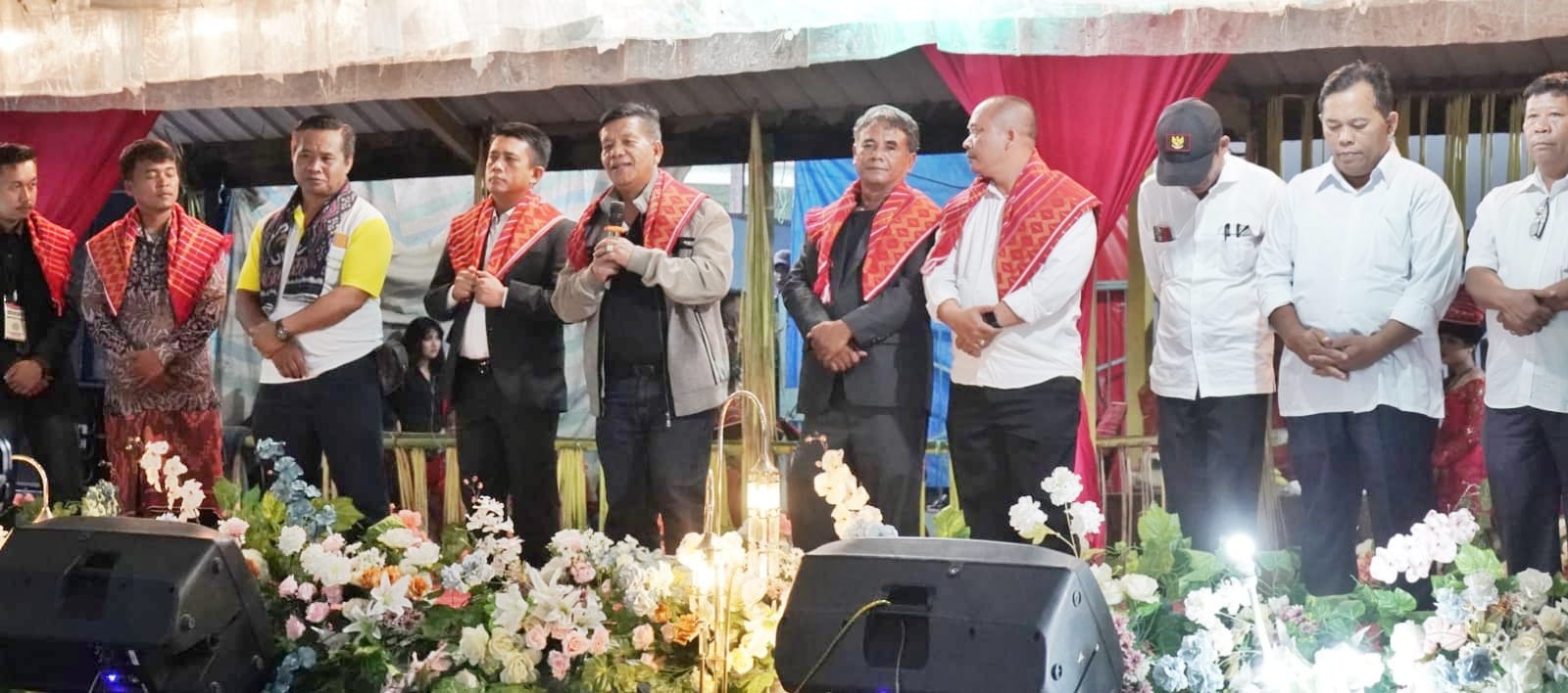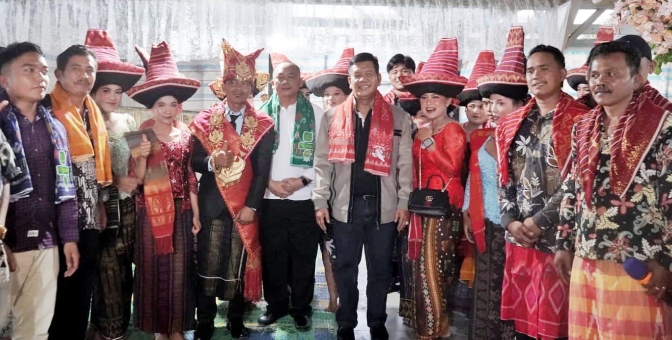 Bupati Simalungun Radiapoh Hasiholan Sinaga bersama wakil ketua DPRD Samrin S. Girsang menghadiri pesta gendang guro-guro aron (pesta budaya kerja tahun) di Nagori Panribuan Jahean, Kecamatan Dolok Silou, Simalungun, Sumut, Jum’at (16/8/2024).