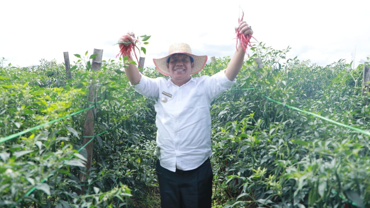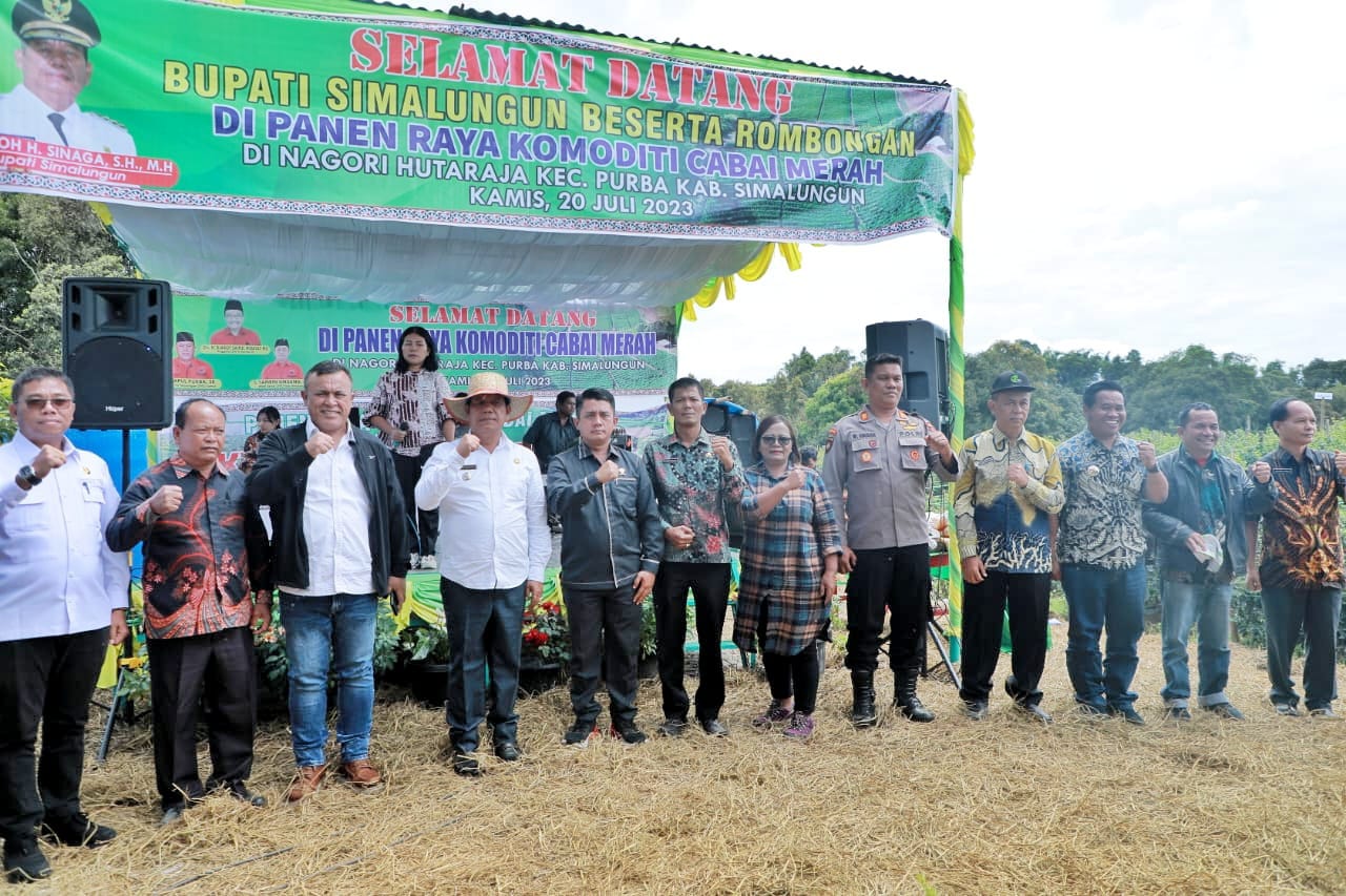 Bupati Simalungun Radiapoh Hasiholan Sinaga, Anggota DPRD Sumut Mangapul Purba, Wakil Ketua DPRD Simalungun Samrin Girsang dan dari Dinas Pertanian Sumut melakukan panen raya komoditi cabai merah, di Nagori Hutaraja, Kecamatan Purba, Kabupaten Simalungun, Sumut, Kamis (20/7/2023).