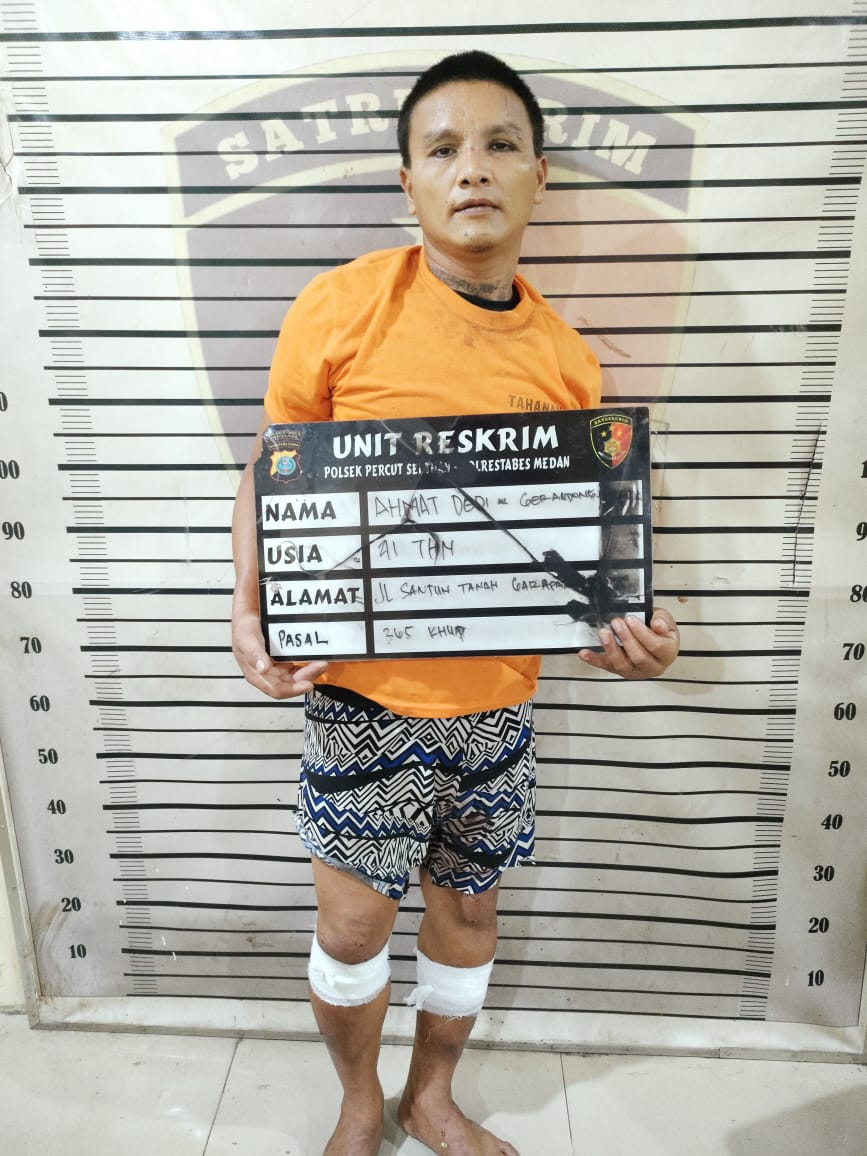 “Kemudian pelaku menerangkan barang bukti sajam berupa parang dan celurit disimpan di rumah Ahmad Dedi Als Dedi Grandong di Jl.Tangkul Gg.Watas No.7, Selanjutnya tim melakukan pengembangan untuk mencari barang bukti di rumah dan tim mengamankan pelaku Ahmad Dedi Als Dedi Grandong dan ditemukan berikut barang bukti yang disimpan didalam goni plastik berupa parang dan celurit. kemudian pada saat dilakukan pengembangan kembali untuk mencari barang bukti sepeda motor, para pelaku berusaha melawan dengan cara mendorong petugas dan hendak melarikan diri sehingga petugas memberikan tindakan tegas dan terukur pada kedua betis kaki pelaku dan setelah itu membawa kedua pelaku ke Rs. Bhayangkara guna dilakukan perawatan dan kemudian membawa para pelaku ke mako polsek Medan Tembung untuk di proses lanjut,” tegas Pria dengan 3 balok emas dipundaknya.