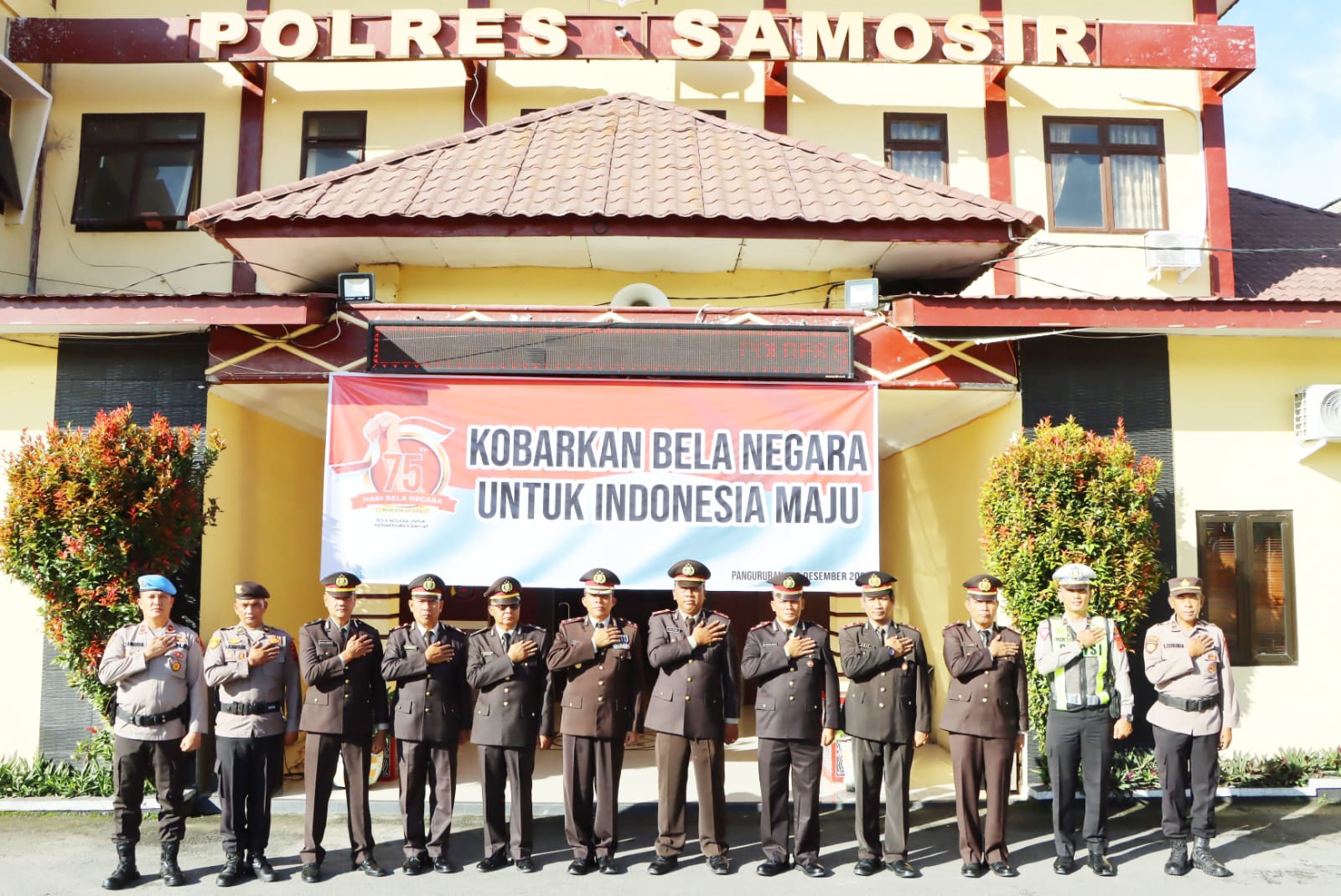 Polres Samosir menggelar upacara peringatan Hari Bela Negara yang ke-75 dengan penuh semangat dan kekompakan. Dipimpin oleh Wakapolres Samosir Kompol S. T Panggabean, S.H, upacara yang berlangsung di lapangan Mako Polres Samosir, Selasa (19 Desember 2023) dengan mengusung thema: menampilkan “Kobarkan Bela Negara Untuk Indonesia Maju, Bela Negara Untuk Memakmurkan Rakyat.”