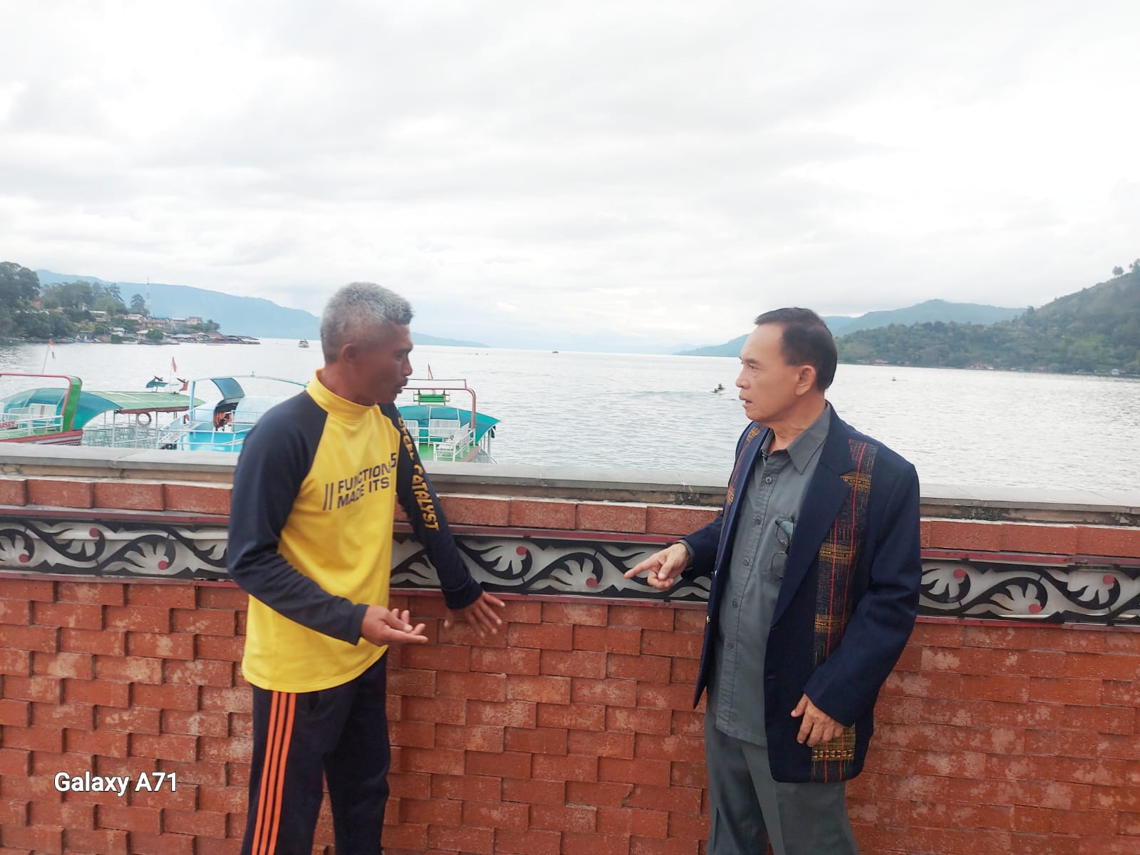 Ketua PHRI Simalungun, saat meninjau lokasi tembok setinggi 6 Meter yang menutupi Dermaga Atsari Parapat.