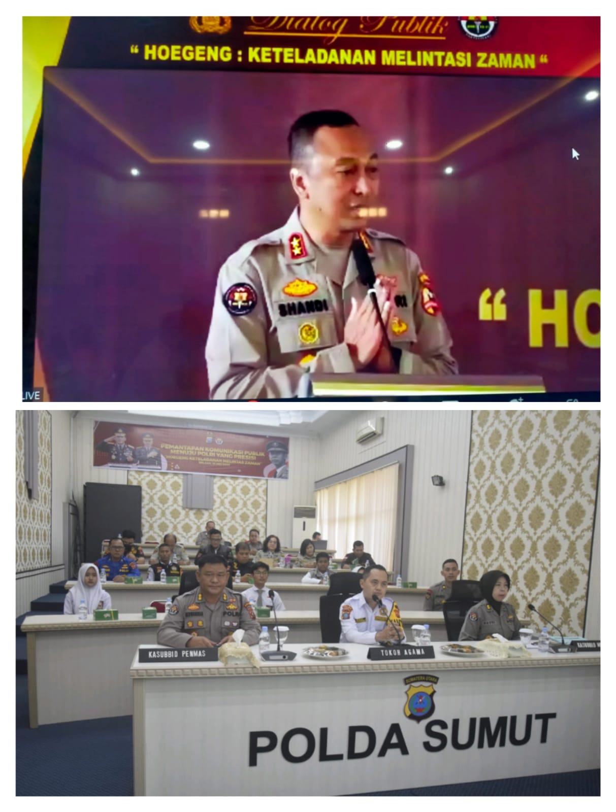 Kepala Kepolisian Daerah Sumatera Utara dalam hal ini diwakili Kasubid Penmas Bid Humas Polda Sumut AKBP Dr Herwansyah,S.H.,M.Si dan Kasubdit Multimedia AKBP Navri Y,S.H.,M.H. mengikuti kegiatan Dialog Publik dengan tema Hoegeng : Keteladanan Melintasi Zaman secara virtual dengan Mabes Polri, Selasa (16/05/2023).