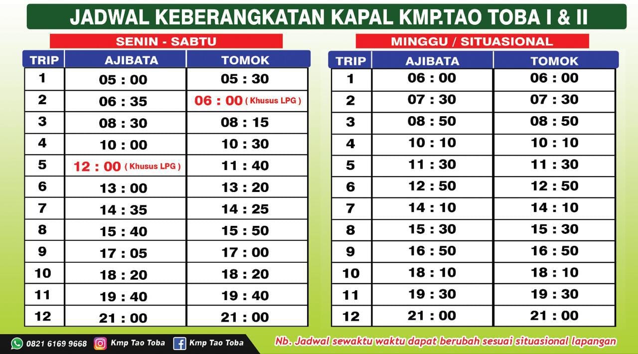 Ini dia jadwal keberangkatan KMP Tao Toba 1 dan 2 dari Ajibata-Tomok dan Tomok Ajibata.|| jess.