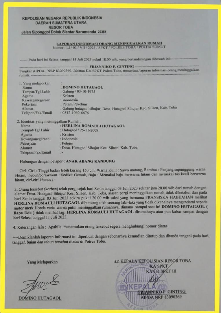 Akhirnya Domino Huragaol dengan kesepakatan dan keputusan bersama pihak keluarga membuat laporan polisi orang hilang ke Polres Toba pada Selasa sore, (11 Juli 2023) dengan laporan informasi orang meninggalkan rumah Nomor : KI/03/VII/2023/SPKT/POLRES TOBA/ POLDA SUMUT.