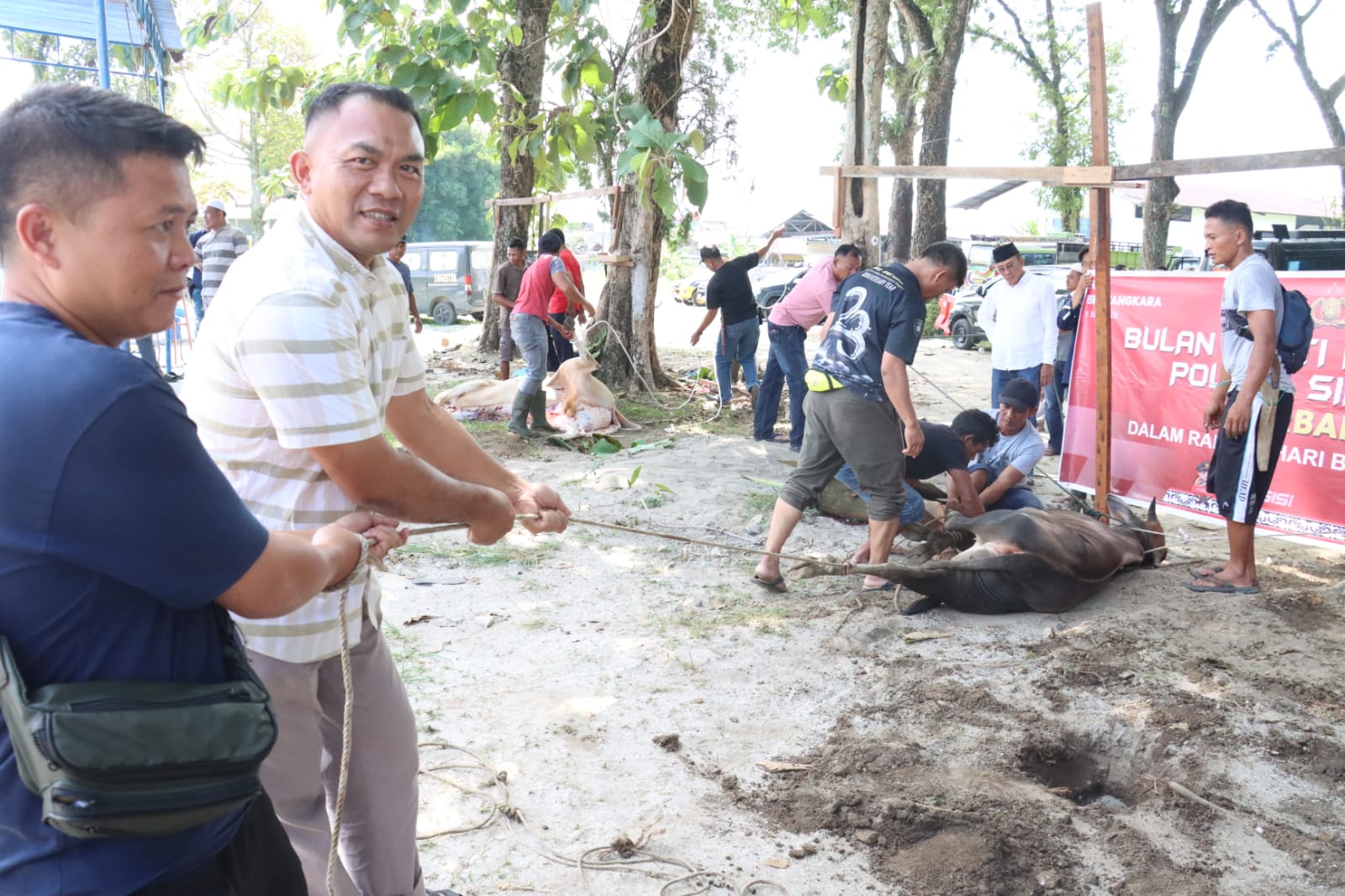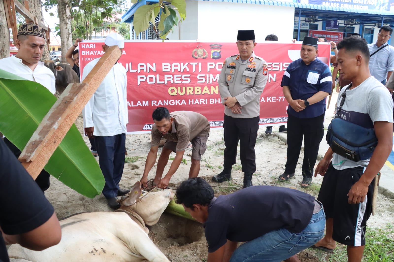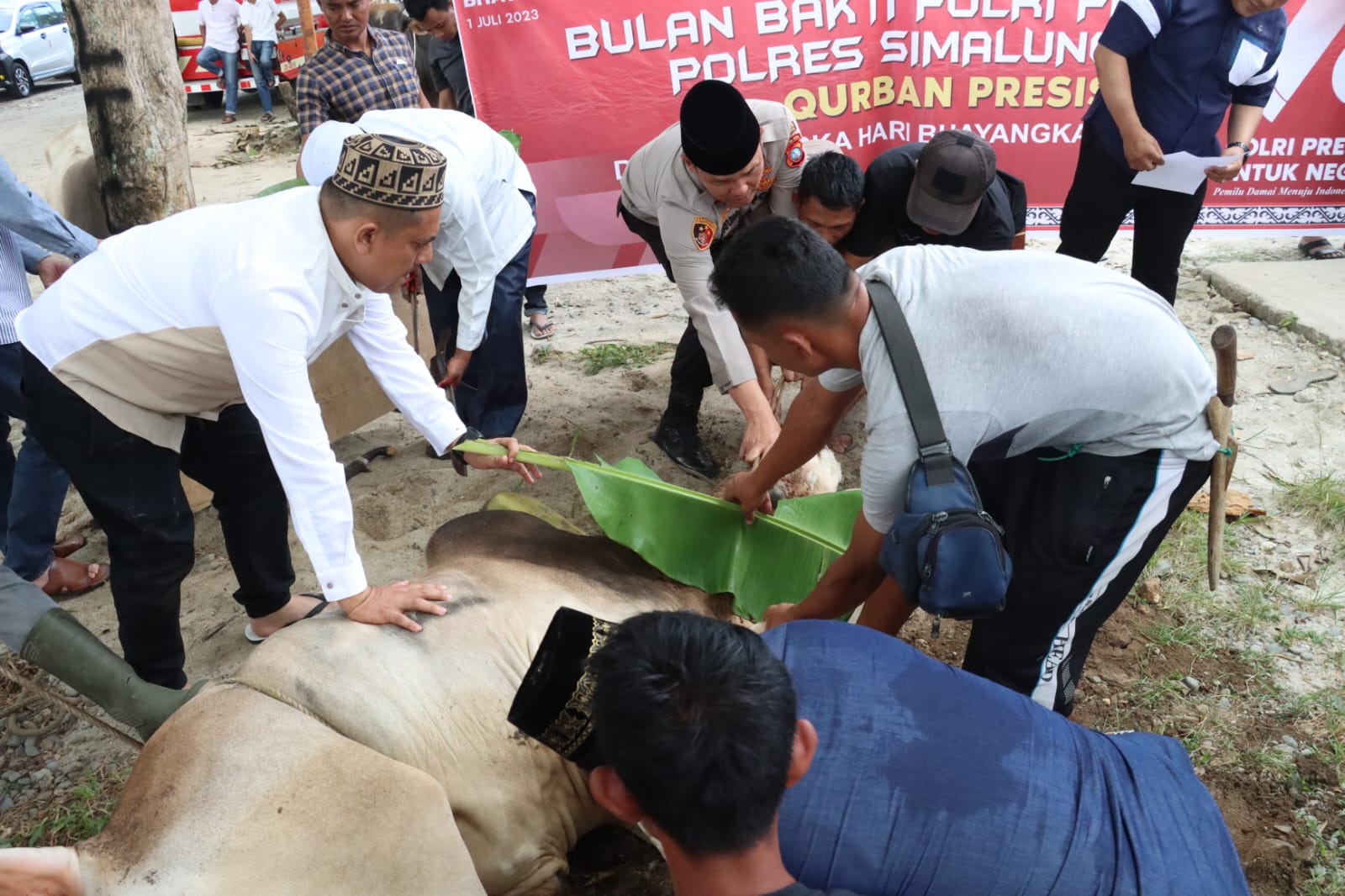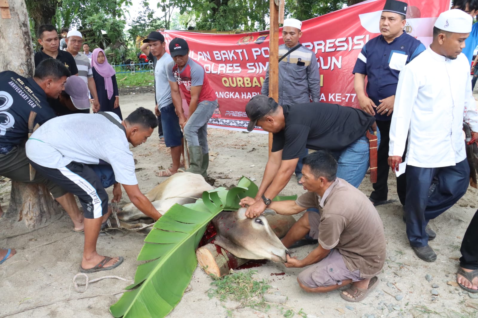 Kapolres Simalungun, AKBP Ronald F.C Sipayung, S.H., S.I.K., M.H., memimpin pelaksanaan Qurban Presisi dalam momentum peringatan Hari Raya Idul Adha 1444H/2023M. Pelaksanaan Qurban Presisi ini merupakan bentuk Implementasi Bulan Bakti Presisi dengan pelaksanaan Pemotongan Hewan Qurban oleh Ustad H. Zainal Abidin, LC., menjelang Hari Bhayangkara ke-77.