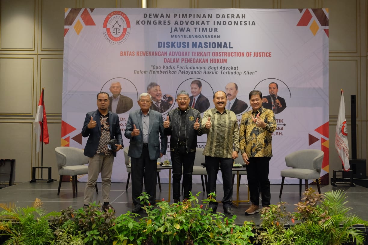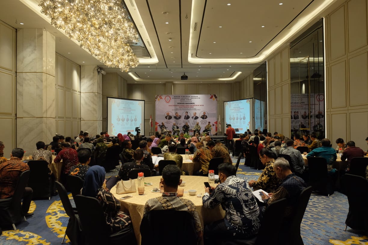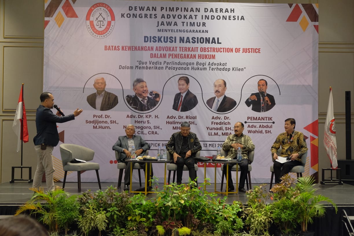 Kongres Advokat Indonesia (KAI) DPD Jawa Timur gelar Halal bihalal dan Diskusi Nasional dengan tema “Batas Kewenangan Advokat Terkait Obstruction of Justice Dalam Penegakan Hukum” dengan Sub tema “Qou Vadis Perlindungan Hukum Bagi Advokat Dalam Memberikan Bantuan Hukum Terhadap Klien, Sabtu 13 Mei 2023. di Hotel Movenpick Surabaya.