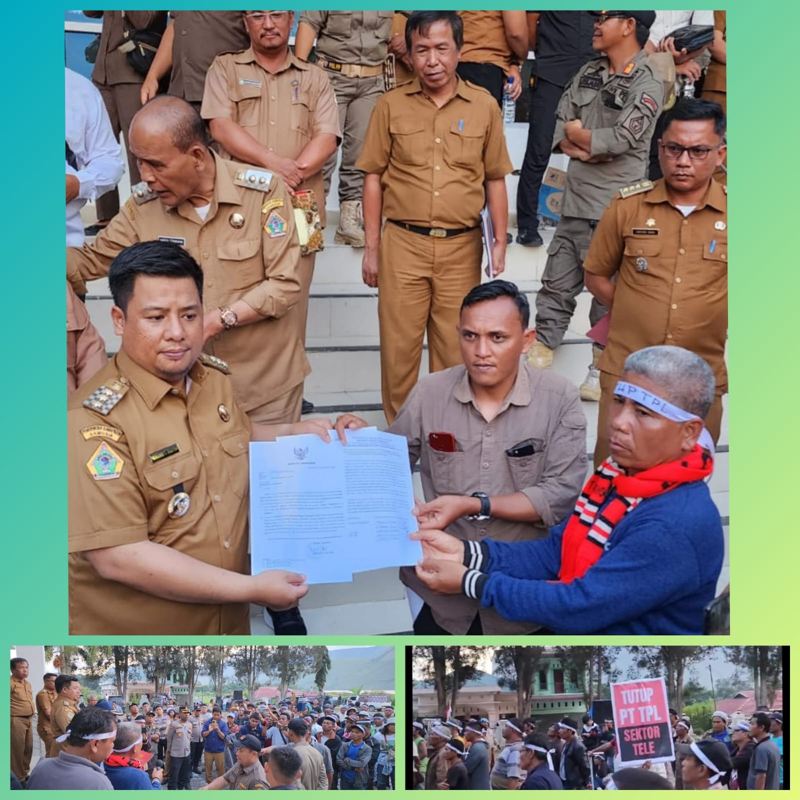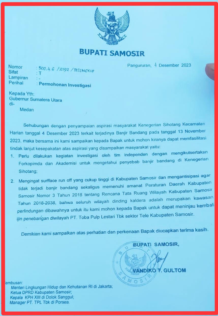 Berita sebelum pasca kejadian banjir bandang yang terjadi dikenegerian Sihotang Kecamatan harian Kabupaten Samosir bawa ratusan Orang masyarakat lakukan “aksi damai penutupan PT TPL Sektor Tele “di kantor Bupati Samosir, alhasil akhirnya Bupati Samosir resmi menyurati Pemerintah atasan agar segera investigasi yang mengikut sertakan dari pihak Independent, Perkopinda dan Ahli atas kejadian musibah Banjir bandang yang terjadi dikenegerian Sihotang.