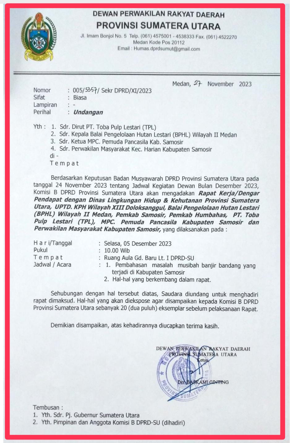 Adapun isi undangan resmi yang ditanda tangani langsung oleh Ketua DPRD Propinsi Sumatera Utara, Drs Baskami Ginting serta peserta undangan yaitu dari Pihak PT TPL Toba Lestari, Badan Pengelola Hutan Lestari, Ormas, serta Masyarakat utusan dari kecamatan Harian Kabupaten Samosir.