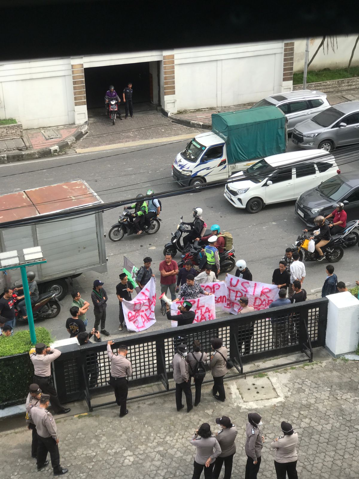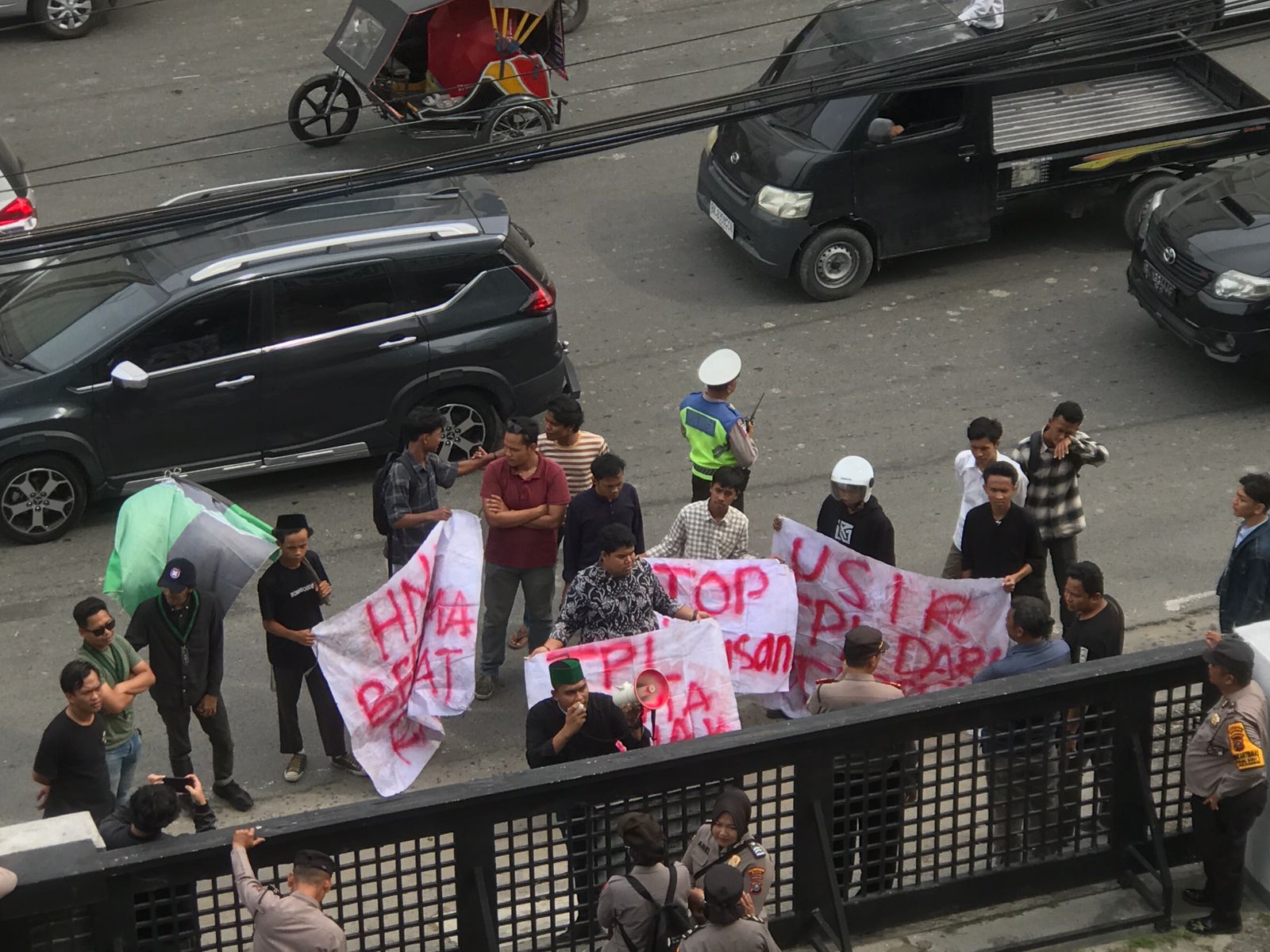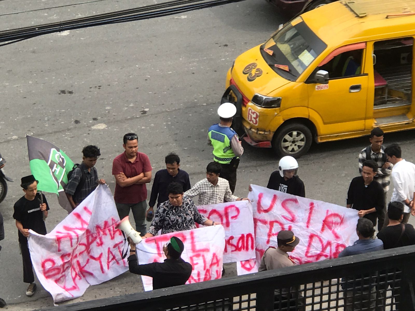 Dalam aksinya, Koordinator aksi Pangeran Siregar dengan mic Pengeras suara menyampaikan tuntutan: