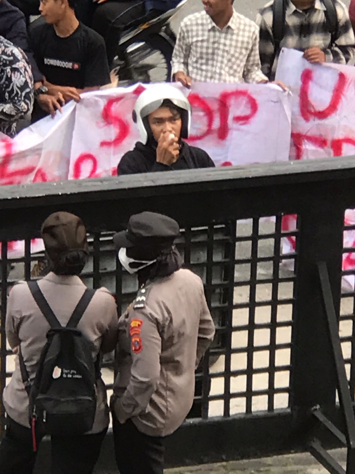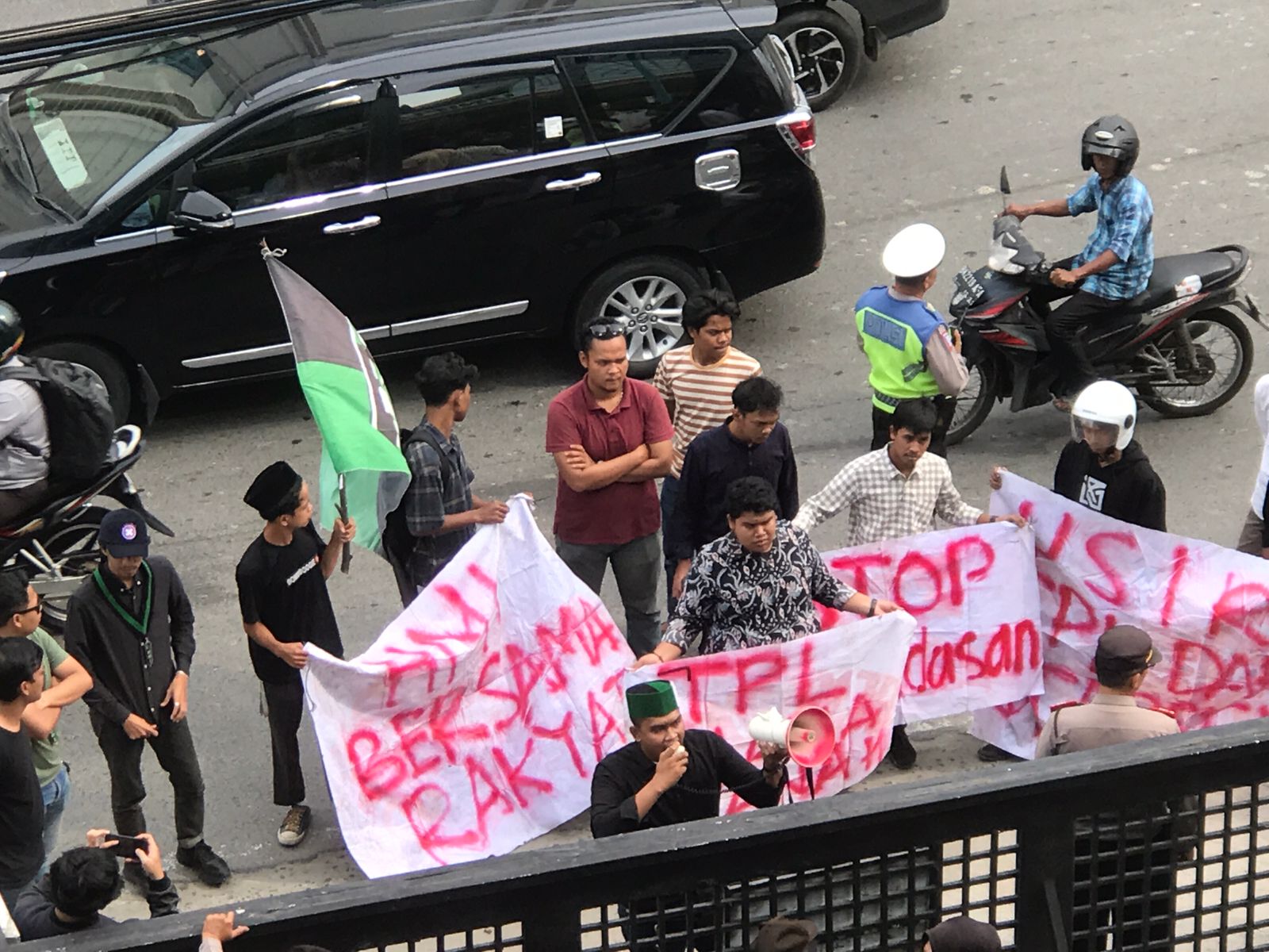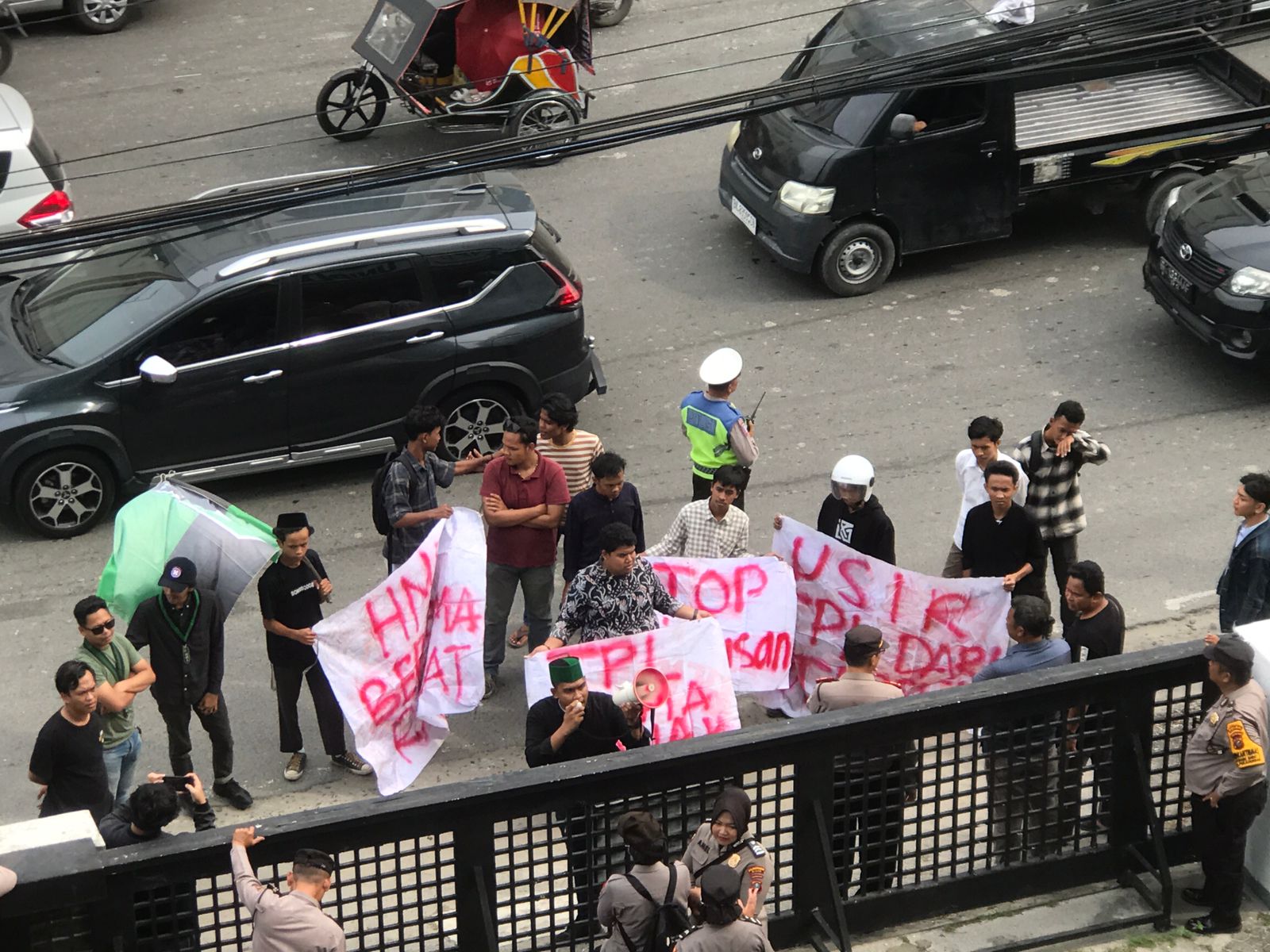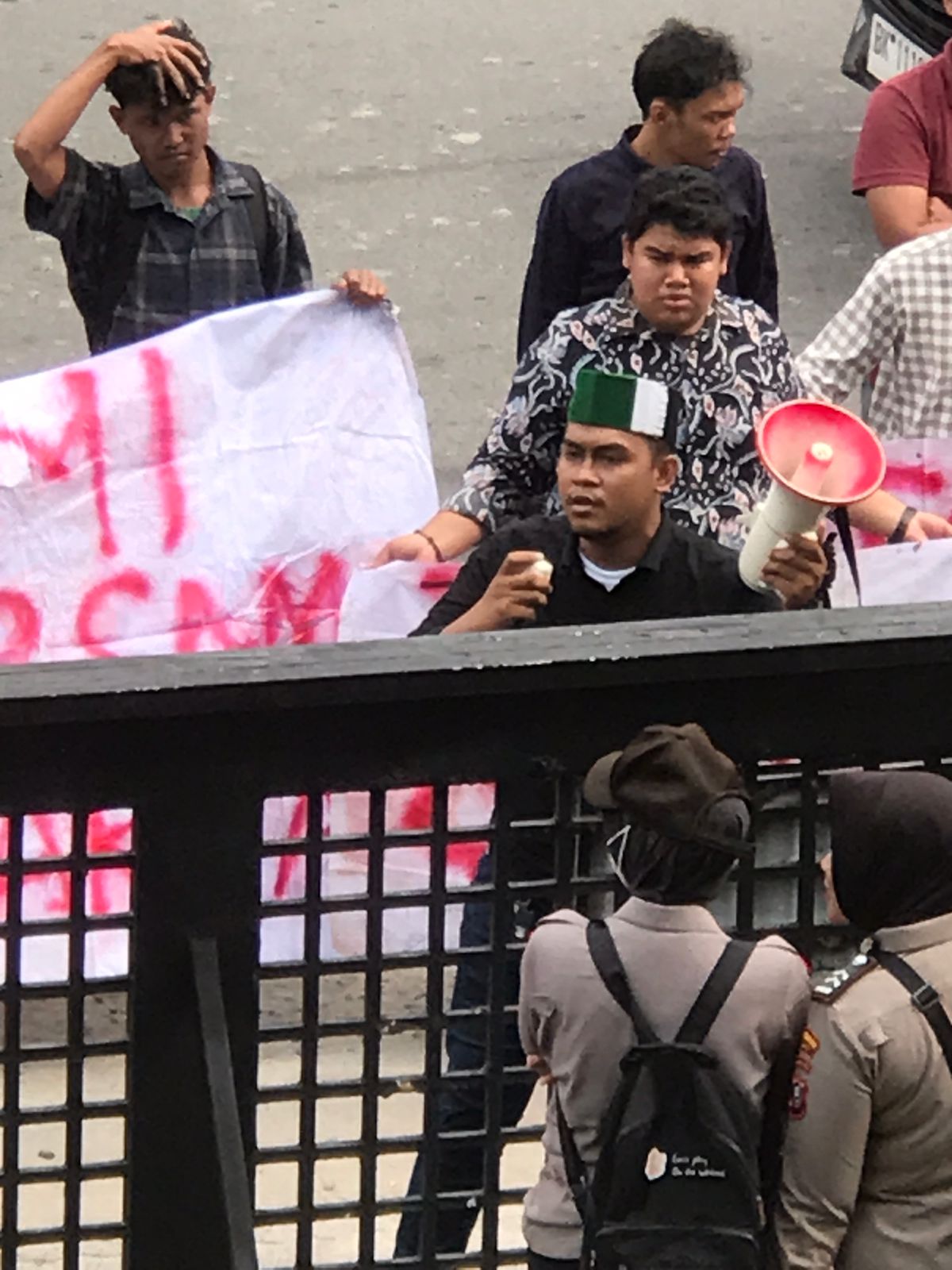Dalam aksinya, Koordinator aksi Pangeran Siregar dengan mic Pengeras suara menyampaikan tuntutan:
