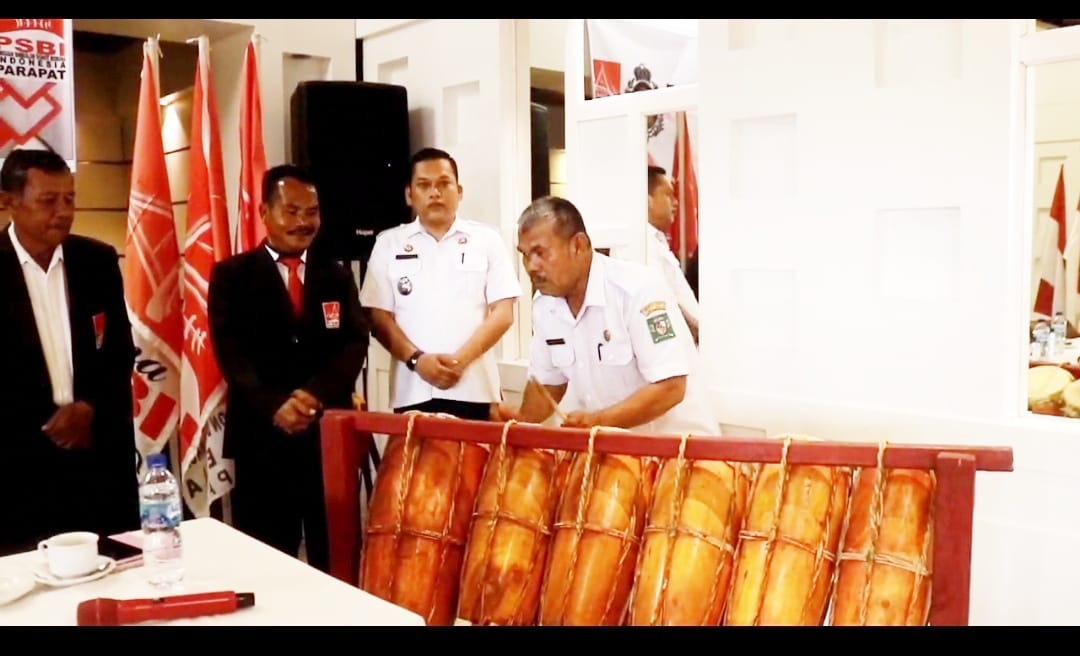 Kaban Kesbangpol Simalungun Arifin Naenggolan memukul Taganing (Gordang) saat membuka Rakerwil PSBI Parapat di Atsari Hotel Parapat.