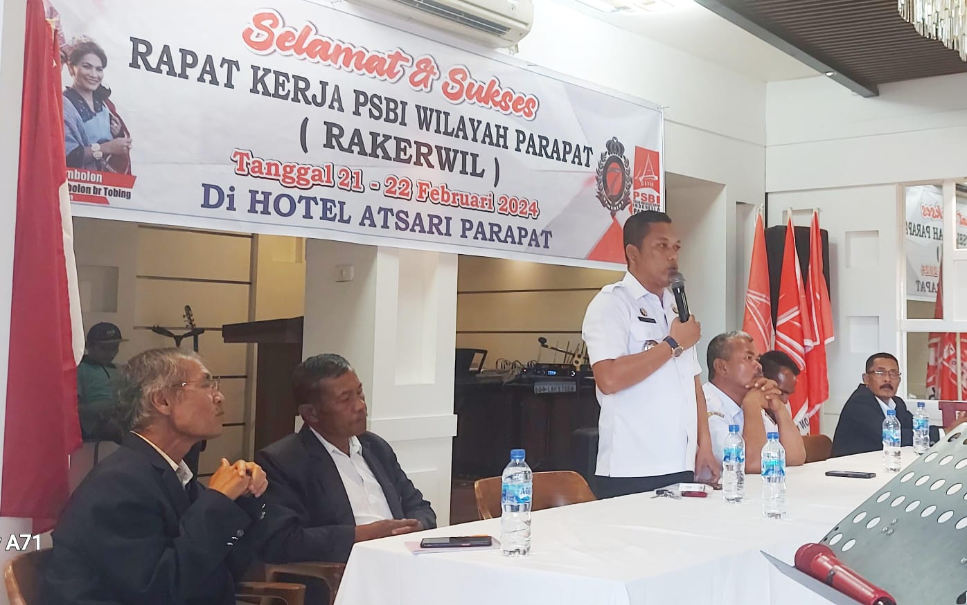 Ketua PSBi Wilayah Parapat, Benris Simbolon saat memimpin Rakerwil di Atsari Hotel Parapat.