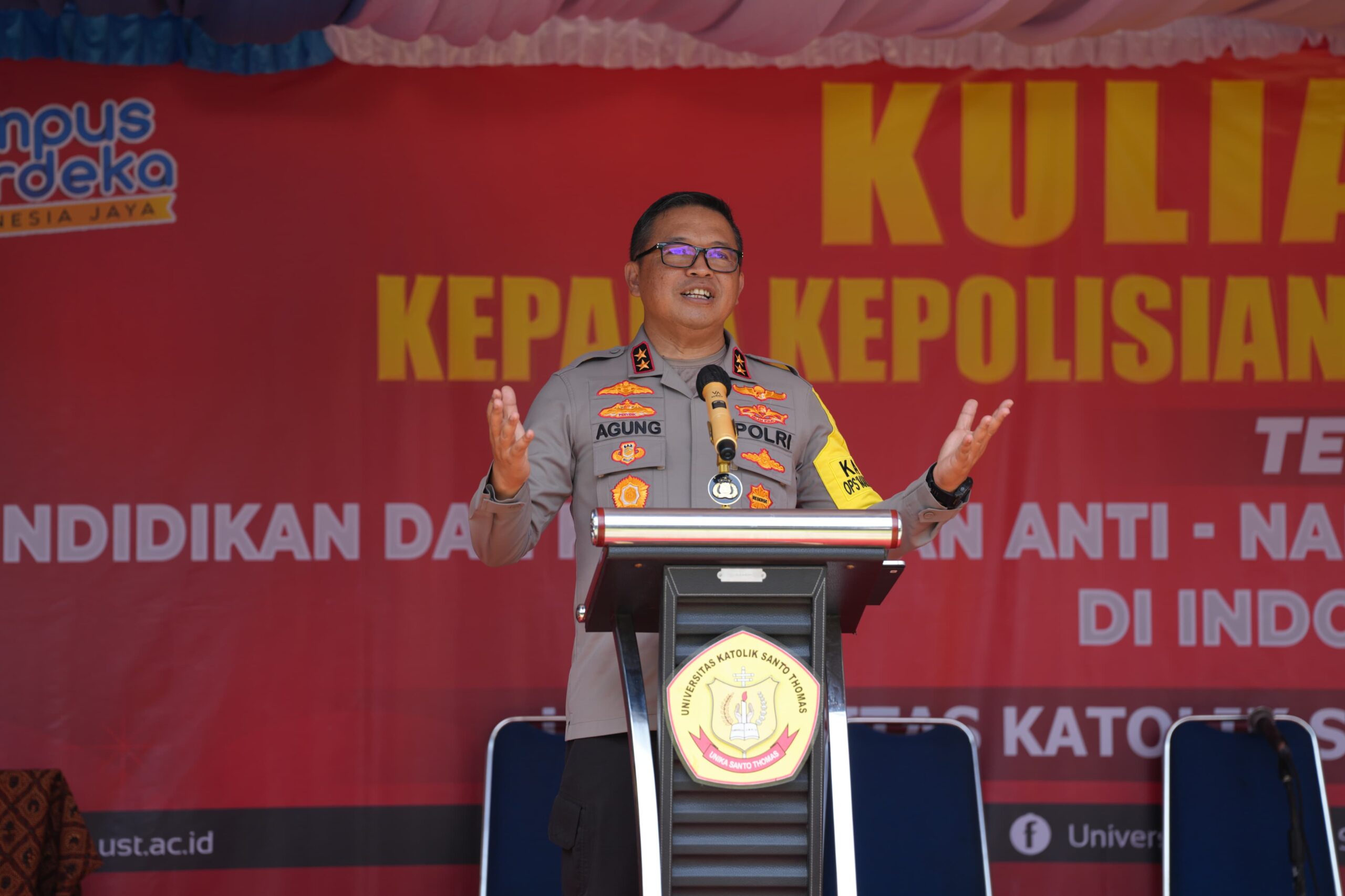 Kapolda Sumut, Irjen Pol Agung Setya Imam Effendi, memberikan kuliah umum di Universitas Khatolik Santo Thomas tentang bahaya penggunaan narkotika, Selasa (19/3).