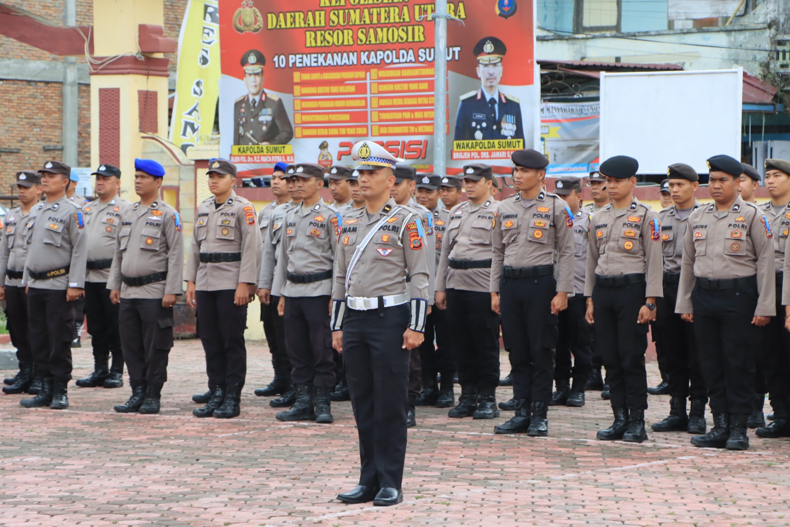 Apel Gelar Pasukan Operasi Patuh Toba 2023 Polres Samosir dalam rangka menurunkan angka pelanggaran kecelakaan lalu lintas, angka fatalitas serta meningkatkan disiplin masyarakat berlalu lintas di wilayah Kab. Samosir, Senin (10 Juli 2023), Pukul 08.20 Wib.