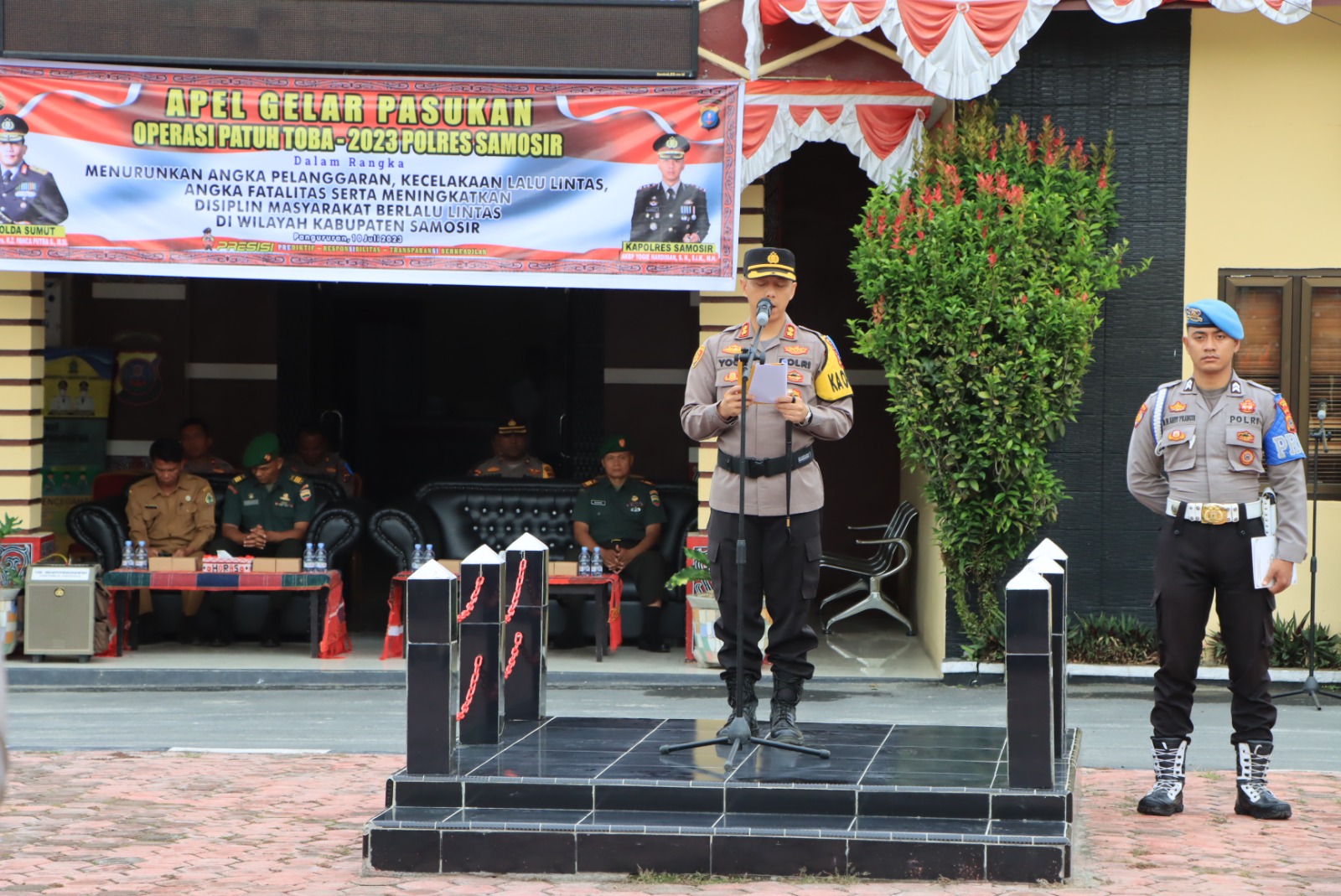 Apel Gelar Pasukan Operasi Patuh Toba 2023 Polres Samosir dalam rangka menurunkan angka pelanggaran kecelakaan lalu lintas, angka fatalitas serta meningkatkan disiplin masyarakat berlalu lintas di wilayah Kab. Samosir, Senin (10 Juli 2023), Pukul 08.20 Wib.