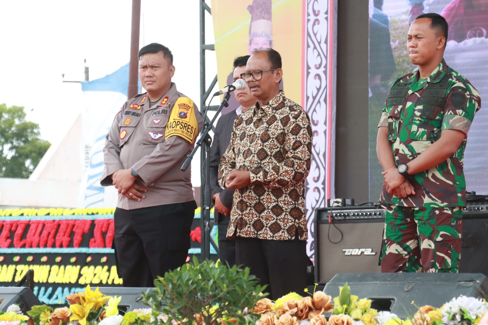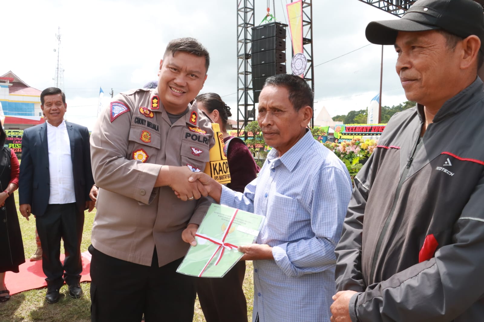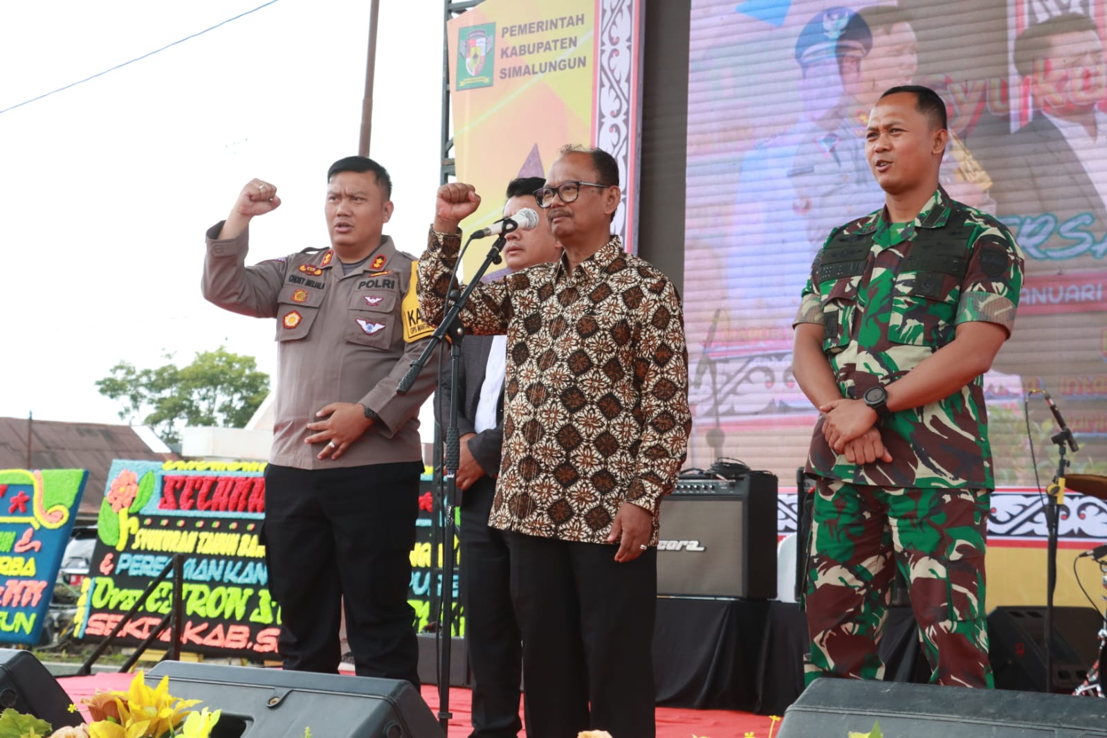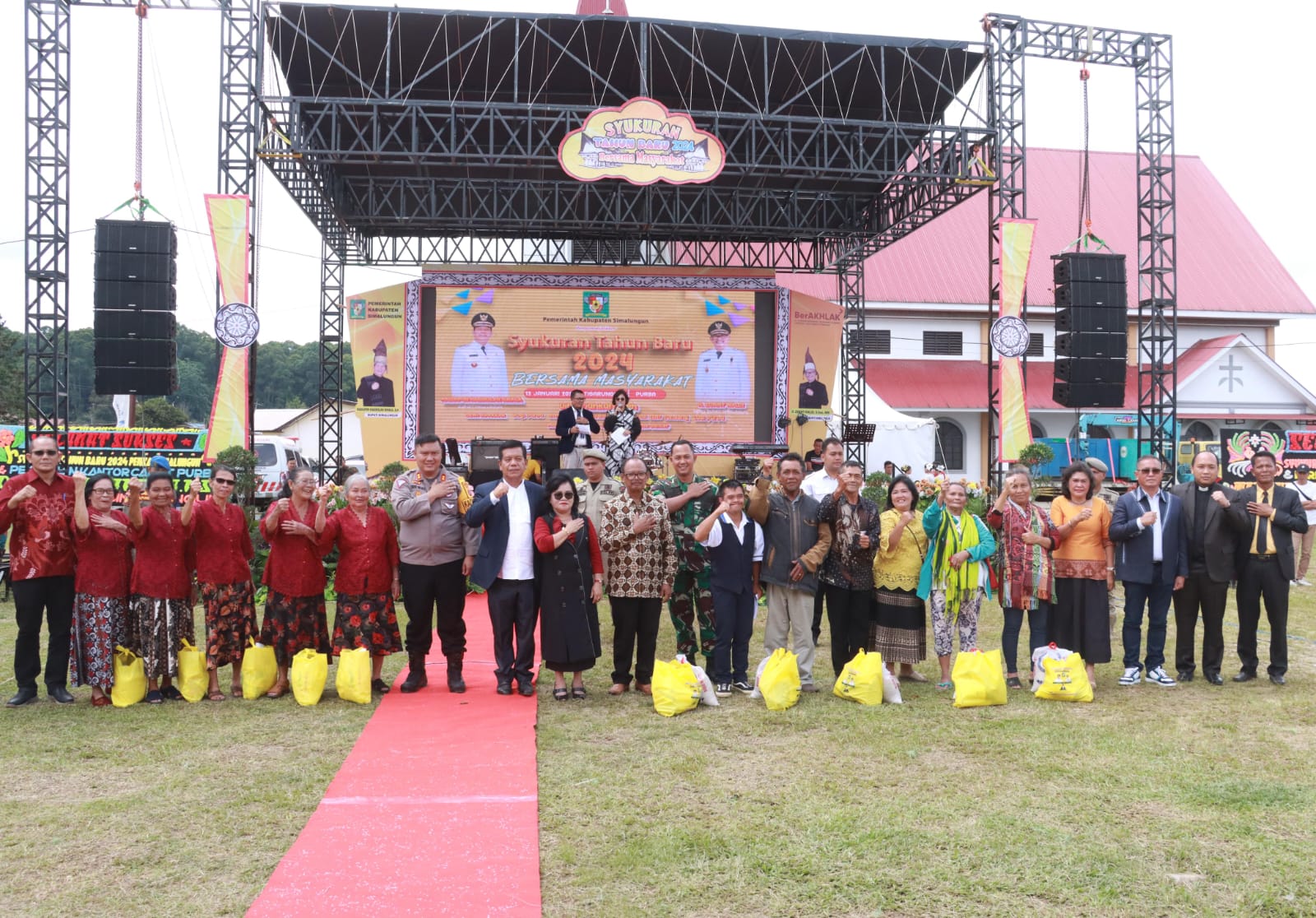 Kapolres Simalungun yang baru, AKBP Choky Sentosa Meliala, S.I.K., S.H., M.H hadiri bersama rombongan Bupati Simalungun, Radiapoh Sinaga (Pemerintah Kabupaten Simalungun) saat merayakan syukuran Tahun Baru 2024 bersama warga setempat di Lapangan Gereja GKPS Tigarunggu, yang dirangkai dengan peresmian Kantor Camat Purba, Sabtu (13 Januari 2024).