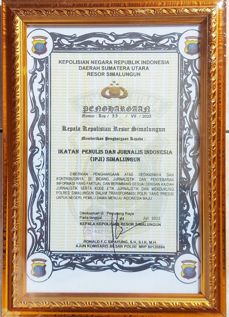 Dalam rangka memperingati Hari Bhayangkara ke-77 yang jatuh pada hari Sabtu, 1 Juli 2022, lalu Kapolres Simalungun AKBP Ronald F. C Sipayung, S.H., S.I.K., M.H., juga memberikan Piagam Penghargaan kepada Ikatan Penulis dan Jurnalis Indonesia (IPJI) DPC Siantar-Simalungun atas kemitraan selama ini.