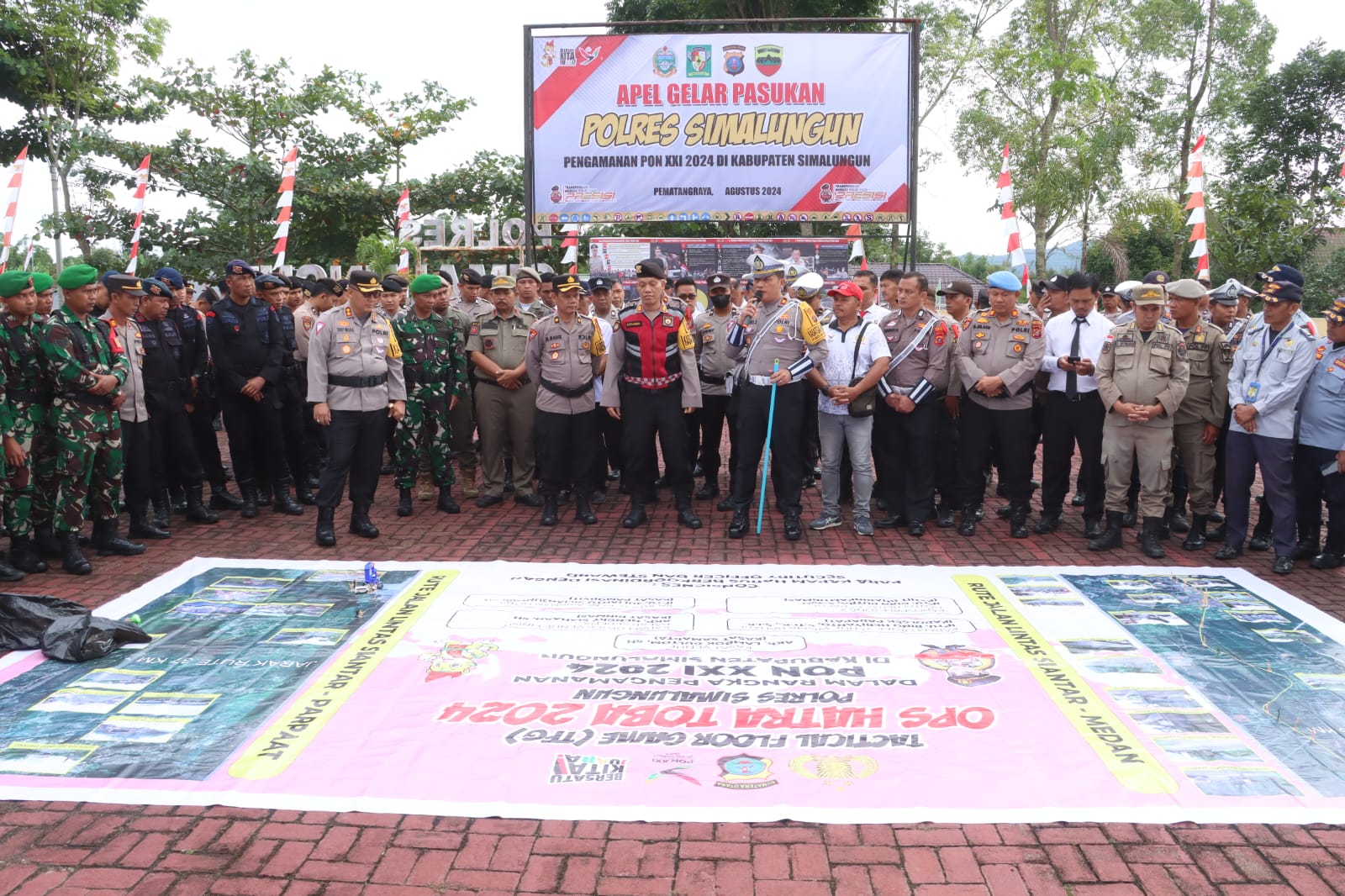 Polres Simalungun menggelar kegiatan Tactical Floor Game (TFG) dalam rangka kesiapan pengamanan Pekan Olahraga Nasional (PON) XXI Tahun 2024. Kegiatan ini dipimpin langsung oleh Kapolres Simalungun, AKBP Choky Sentosa Meliala, S.I.K., S.H., M.H., dan dilaksanakan pada Rabu, 28 Agustus 2024, pukul 09.30 WIB di Lapangan Apel Mako Polres Simalungun, Jalan Jhon Horailam Saragih, Pamatang Raya, Kecamatan Raya, Kabupaten Simalungun.