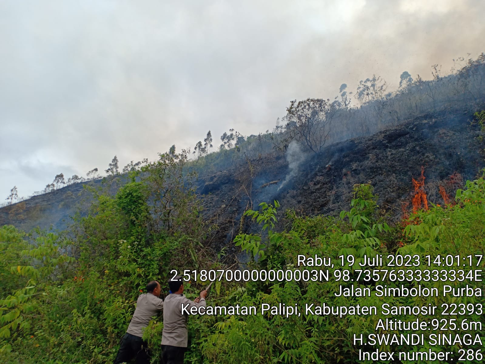 Bripka Jariahman Saragih dari Polsek Palipi menjadi saksi awal terjadinya kebakaran dan segera melaporkan insiden ini ke WA Grup Karhutla Kec. Sitio-tio untuk mendapatkan bantuan dari pemerintah setempat dan stakeholder terkait.