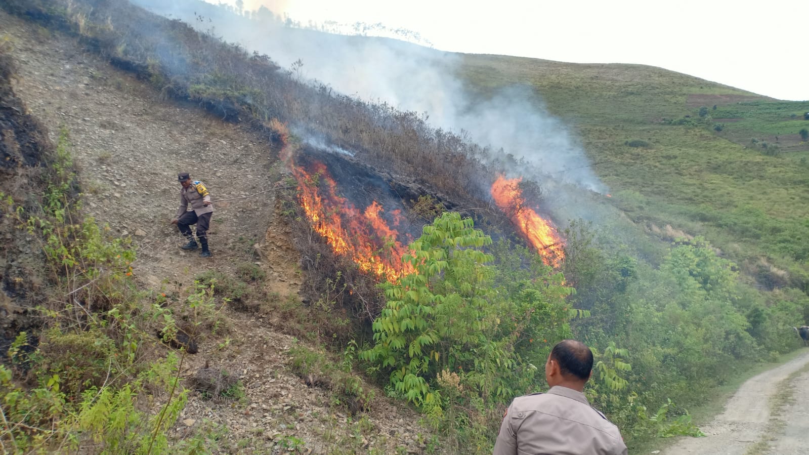 Meskipun lahan yang terbakar merupakan lahan kosong yang ditumbuhi rerumputan alang-alang, api dengan cepat menyebar karena kondisi yang kering dan angin kencang. Kapolsek Palipi bekerja sama dengan Camat Sitio-tio dan Kepala Desa Cinta Maju bersama masyarakat sekitar berusaha keras memadamkan api dengan menggunakan alat seadanya.