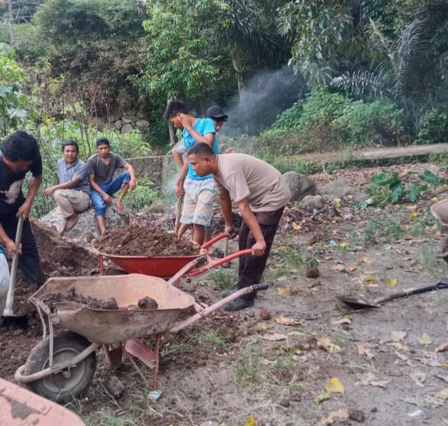 Bersama-sama, mereka meratakan tanah di halaman masjid menggunakan cangkul dan sekop untuk mempersiapkan lokasi parkir. Personel Polsek Harian juga membantu memindahkan tanah timbunan ke lokasi teras masjid menggunakan gerobak roda, yang nantinya akan diubah menjadi berlantaikan keramik.