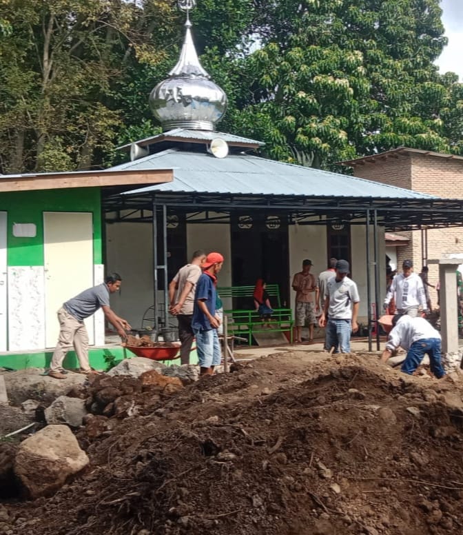 Kegiatan gotong royong dimulai pada pukul 09.00 WIB dan melibatkan Personel Polsek Harian Boho, jemaah Masjid Nurul Huda dan Personel Koramil 04 Harian Boho.