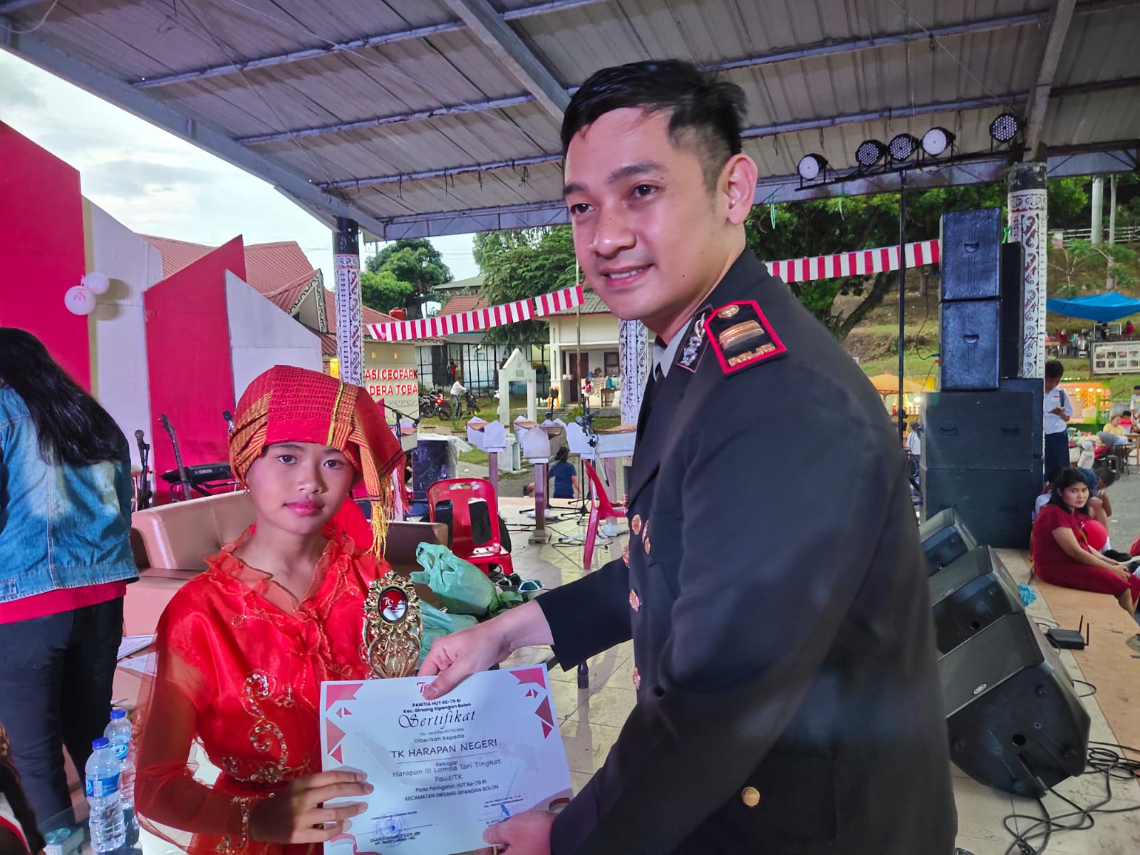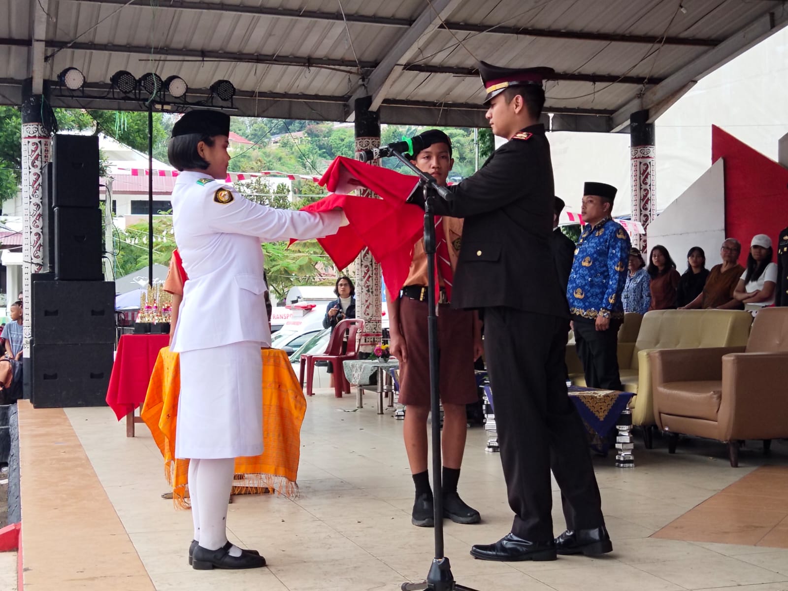 Kendati sempat diguyur hujan, Ratusan masyarakat masih menunggu upacara penurunan Bendera Merah Putih dan Kapolsek Parapat Iptu Rino Heriyanto STr.K, S.I.K menjadi Inspektur Upacara (Irup).