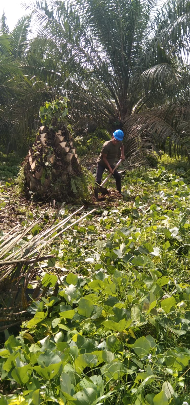 Selain membersihkan gulma juga dilaksanakan penumbangan terhadap pokok yang terserang penyakit dan akan dilaksanakan penyisipan pokok ungkap Roni kepada awak media.