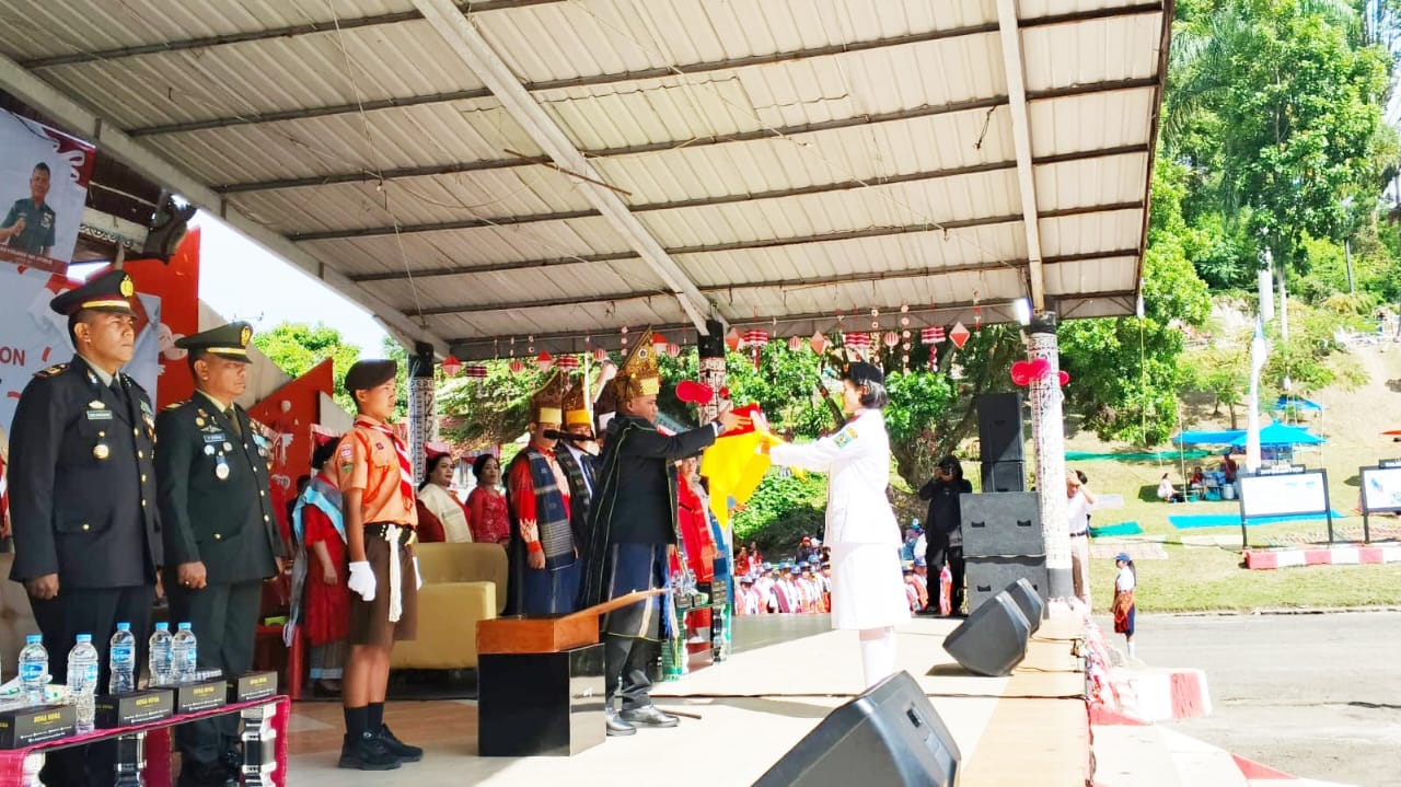 Camat Girsip, Viktor Sijabat sebagai Inspektur Upacara, saat memberikan Bendera untuk dikibarkan oleh tim Paskibra.