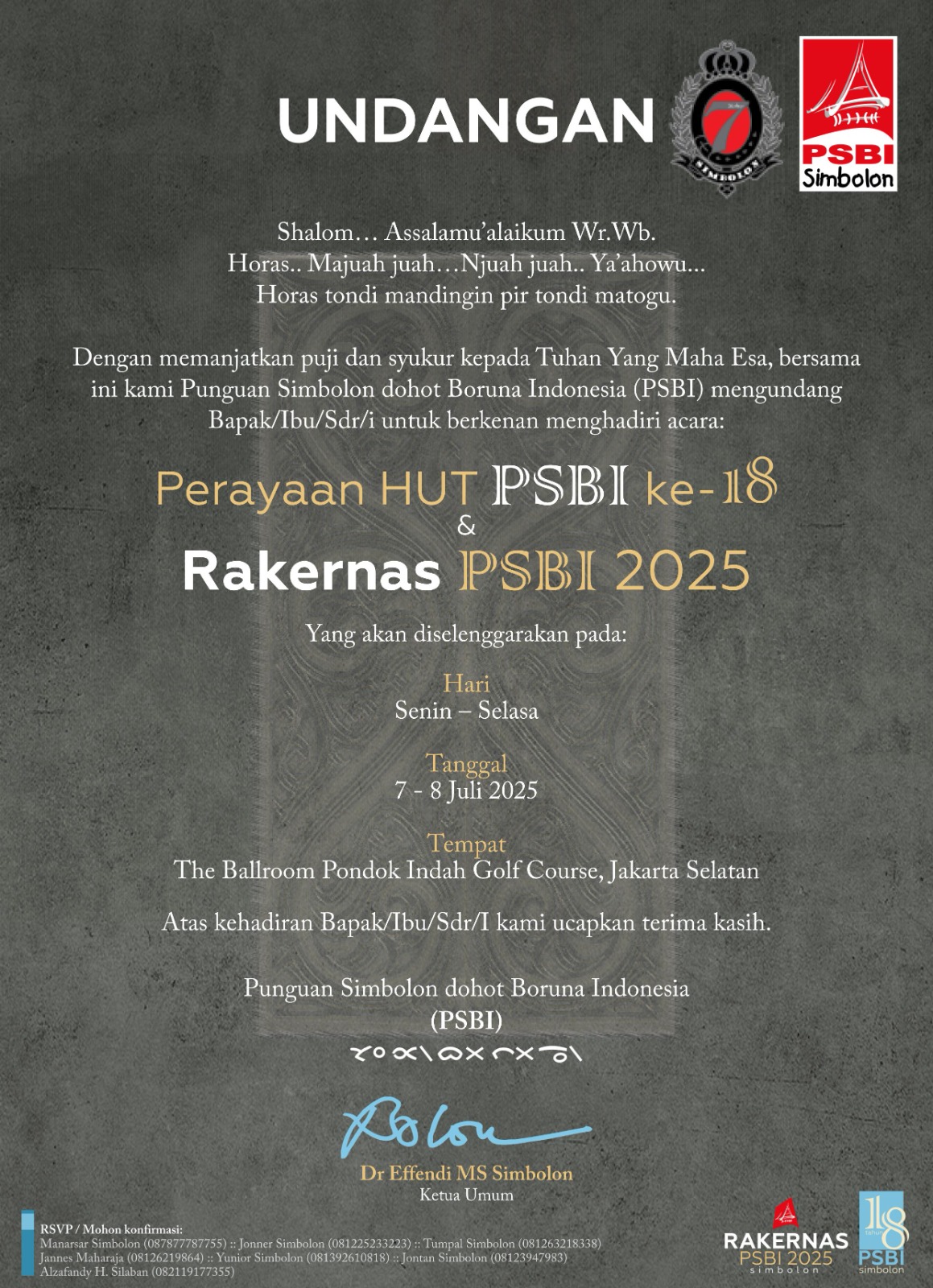 Rapat Kerja Nasional (Rakernas) Punguan Simbolon dohot Boruna Indonesia (PSBI) ke-18 yang bakal digelar di The Ballroom Pondok Indah Golf Course, Jakarta Selatan, Selasa-Rabu (7-8 Juli 2025) direncanakan dibuka Wakil Presiden RI, Gibran Rakabuming Raka.