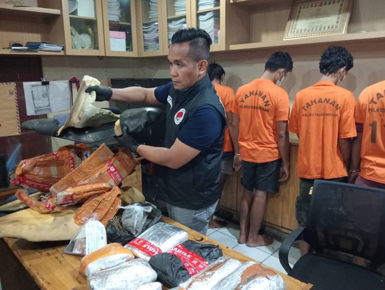Adrian mengungkapkan, dari hasil penyelidikan diamankan empat orang di wilayah Kota Medan dan Deliserdang dengan menyita barang bukti ganja sebanyak 10 bungkus seberat 5,7 kg yang diselundupkan melalui paket sparepart motor.