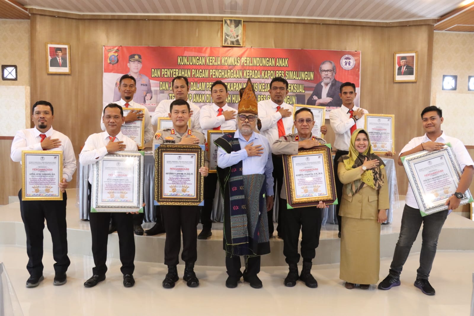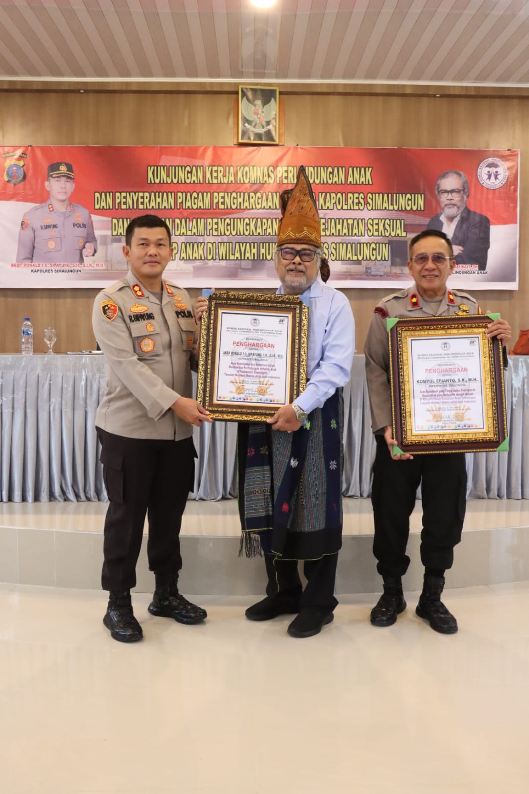Dengan adanya kunjungan dan pemberian Piagam Pengghargaan Apresiasi dari Komisi Nasional Perlindungan Anak, kami dari Polres Simalungun bersama instansi terkait tentu akan bekerja keras untuk bisa menyelamatkan anak-anak kita supaya tidak menjadi korban, dan juga anak-anak kita yang tidak terlibat dalam kejahatan,” ujar AKBP Ronald.