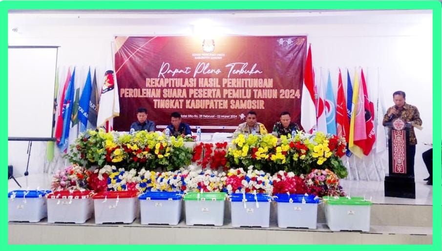Komisi Pemilihan Umum (KPU) Kabupaten Samosir melaksanakan Rapat pleno terbuka. tentang hasil rekapitulasi penghitungan suara peserta pemilu Tahun 2024 kabupaten Samosir, di Hotel Sitiotio,Pangururan, Kamis, (29/2/2024).