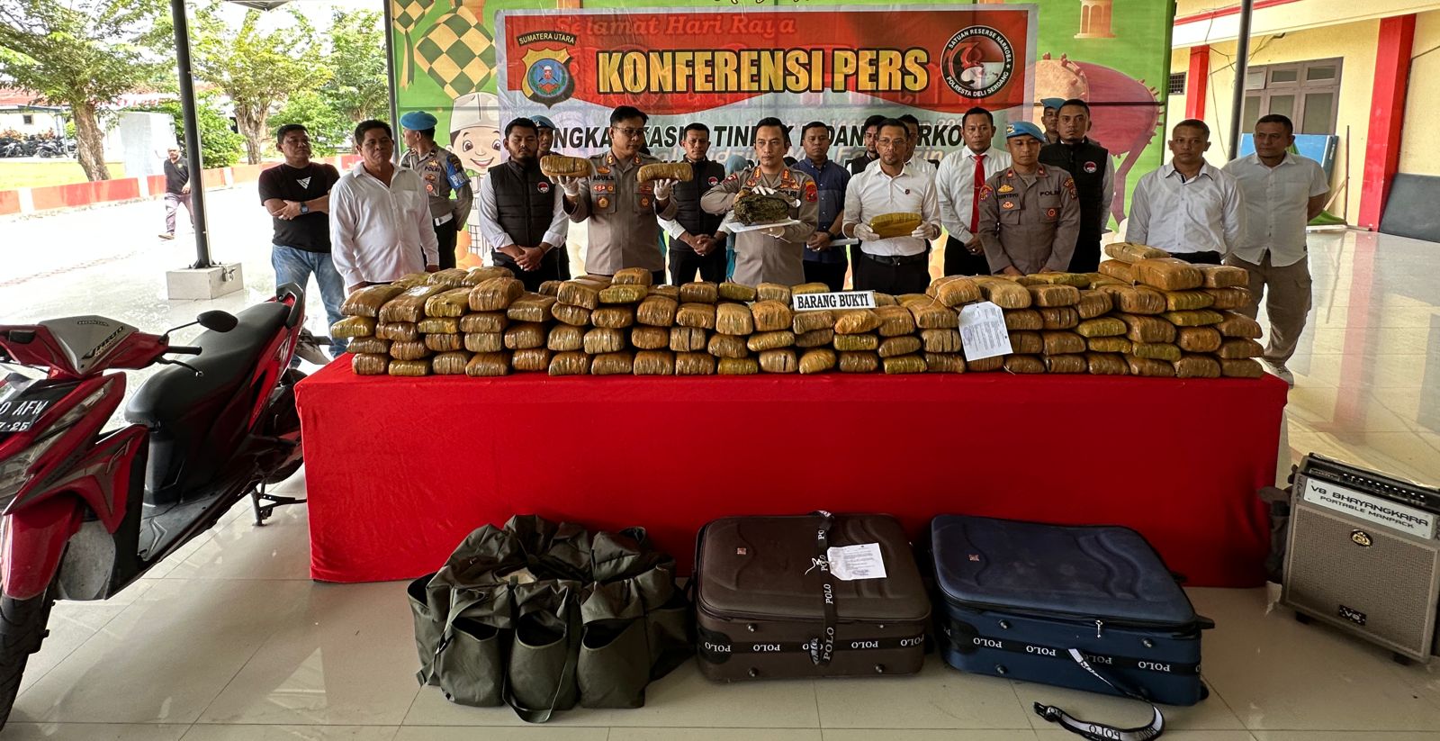Lanjut Kapolresta Deli Serdang Kombes Pol Irsan Sinuhaji,SIK,MH, Menanggapi laporan tersebut, Personil kemudian melakukan penyelidikan dan dengan cara Undercover Buy dan membuat perjanjian transaksi bersama tersangka. Setibanya di Lokasi dan waktu yang sudah ditentukan. Akhirnya Personil berhasil membekuk seorang tersangka inisial BF (38) Lk, Warga Pasar III Dusun XV, Tembung Kec. Percut Sei Tuan beserta barang bukti yakni 3 bungkus Narkotika jenis Ganja terbungkus dengan lakban warna kuning dengan berat 3 Kg dan satu unit sepeda motor Honda Vario yang digunakan oleh Tersangka.