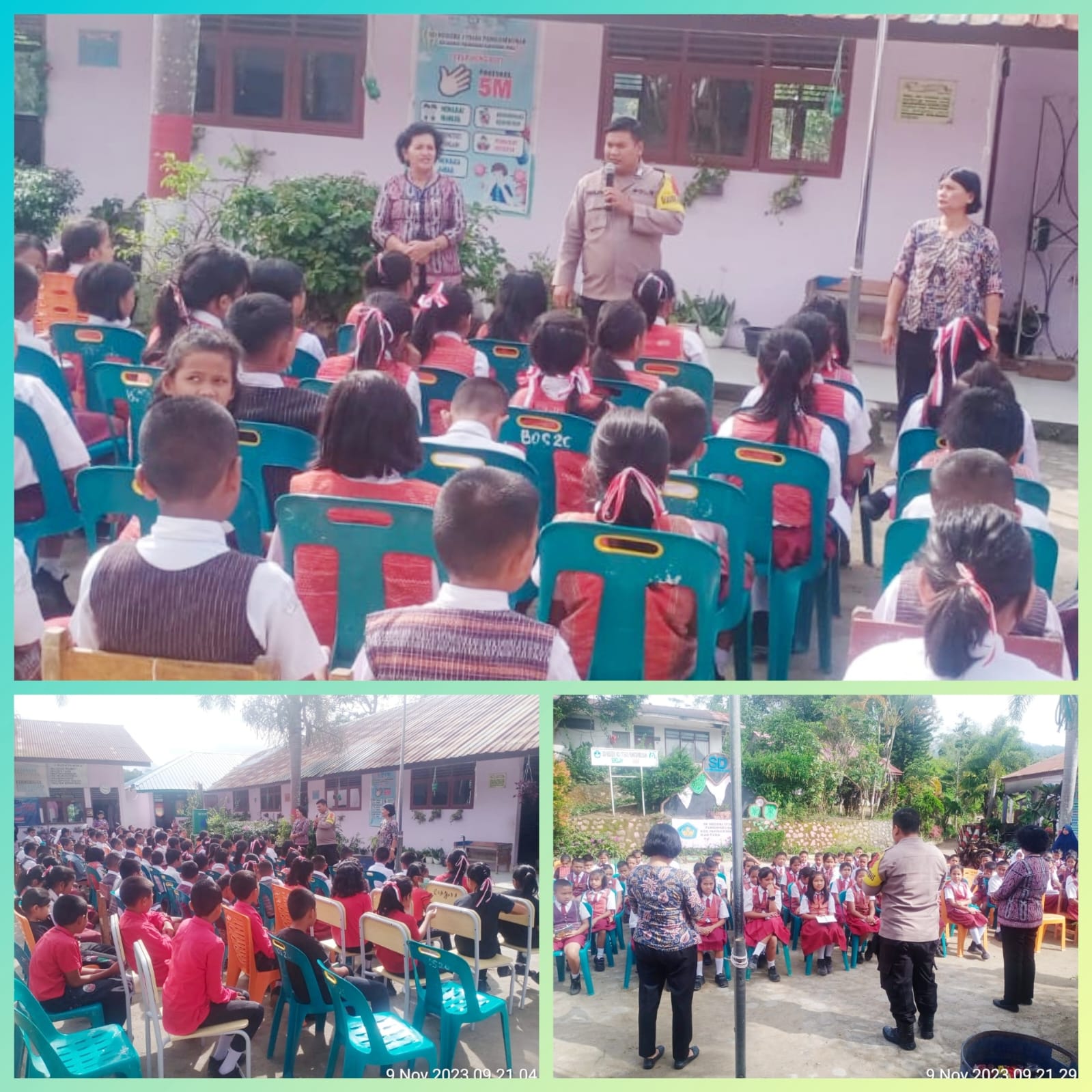 Bhabinkamtibmas Polsek Porsea Aipda Joko Sitorus dan Bripka Derlan Sianturi melaksanakan Police Goes To School (PGS) memberikan pembinaan dan penyuluhan tertib berlalu lintas kepada siswa dan siswi SD Negeri 173643 Pangombusan Kecamatan Parmaksian Kabupaten Toba Provinsi Sumatera Utara, Kamis (9/11/2023).