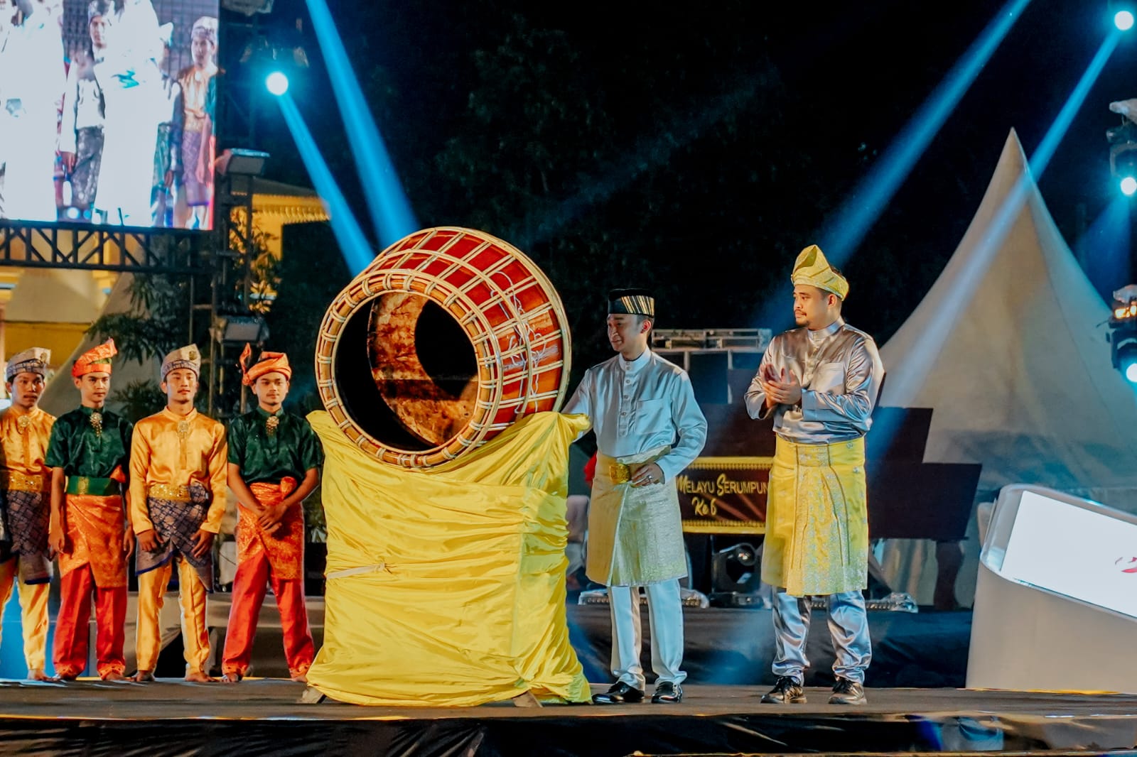 Pemukulan gendang oleh Wakil Menteri Pariwisata dan Ekonomi Kreatif (Menparekraf) Republik Indonesia Angela Tanoesoedibjo bersama dengan Wali Kota Medan Bobby Nasution dan Sultan Deli Tuanku Mahmud Aria Lamantjiji Perkasa Alam Shah menandai dibukanya event Gelar Melayu Serumpun 2023 yang diadakan di Istana Maimun,Selasa (16/5) malam.